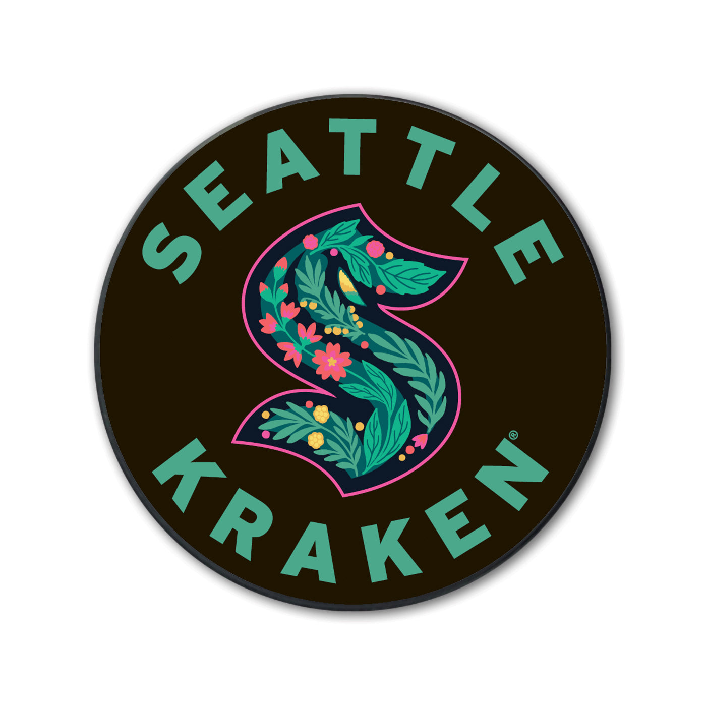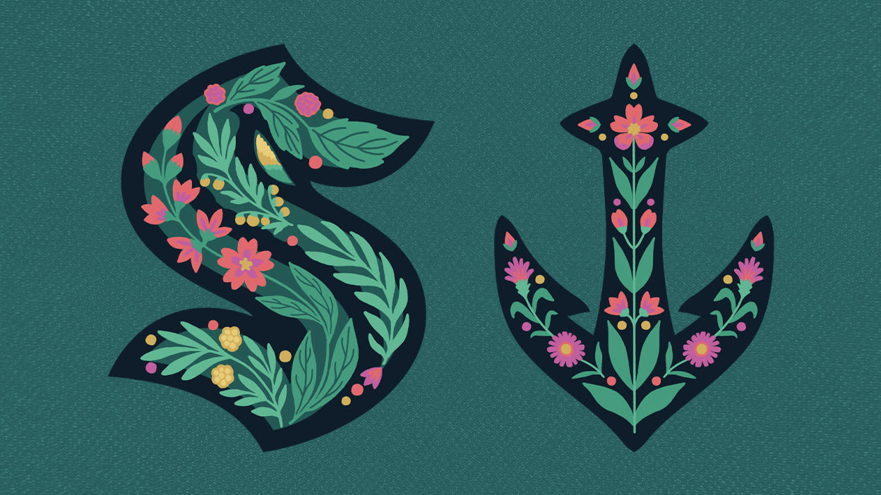 For most of my artwork, the flowers and plants I create are imagined. However, for this project, I researched endangered and threatened flowers in Washington and created my interpretations of them. The Kraken S features seven different plants, including Kincaid’s Lupine, Northwest Raspberry, and Golden Paintbrush for the Kraken's eye. The Anchor includes two types of flowers: Wenatchee Mountain Checker-Mallow and Jessica's Aster. While the actual plants vary in colors such as white, soft purple, and fuchsia, my interpretations focus on a more vibrant palette. My recent work is known for contrasting bright reds and pinks against rich, dark green backgrounds, and I felt this combination would create more visual excitement than focusing on a solely green palette. Teal leaves tie the elements together, especially in the numbers, which feature intricate vines forming each shape. Finally, I was able to draw on my expertise as a surface designer to create a variety of lush patterns composed of elements pulled from the two logos.
