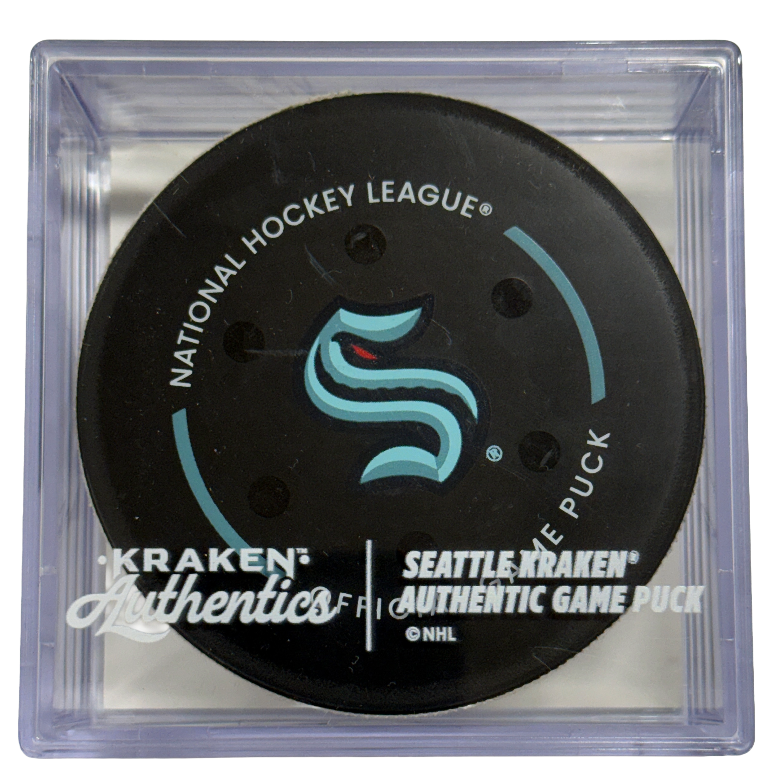 Other warm-up, game-used, and goal pucks from this game are also available through Kraken Authentics (subject to availability).