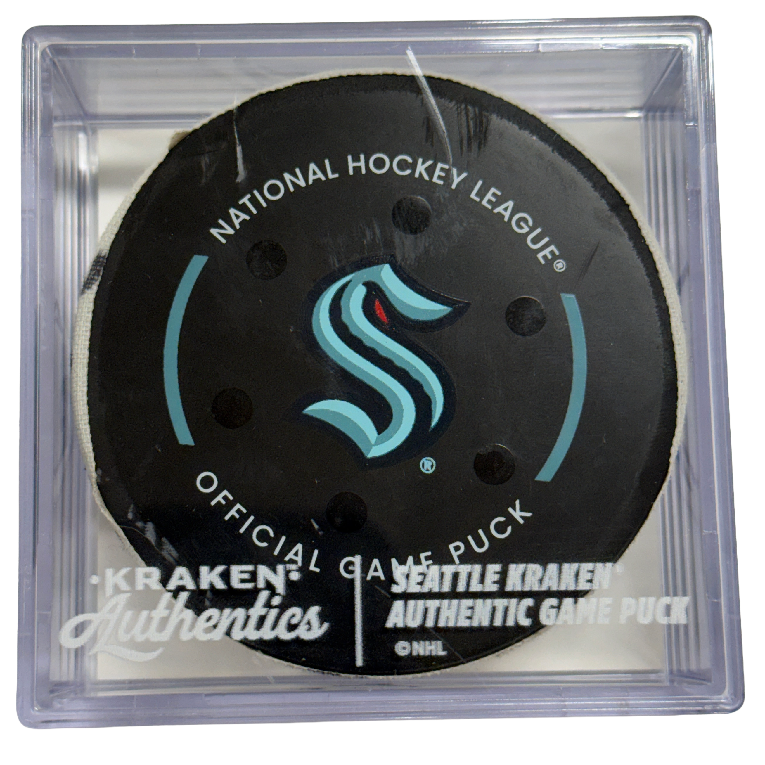 This game-used puck is authenticated by OpSec and includes a Certificate of Authenticity along with a Kraken Authentics puck cube.