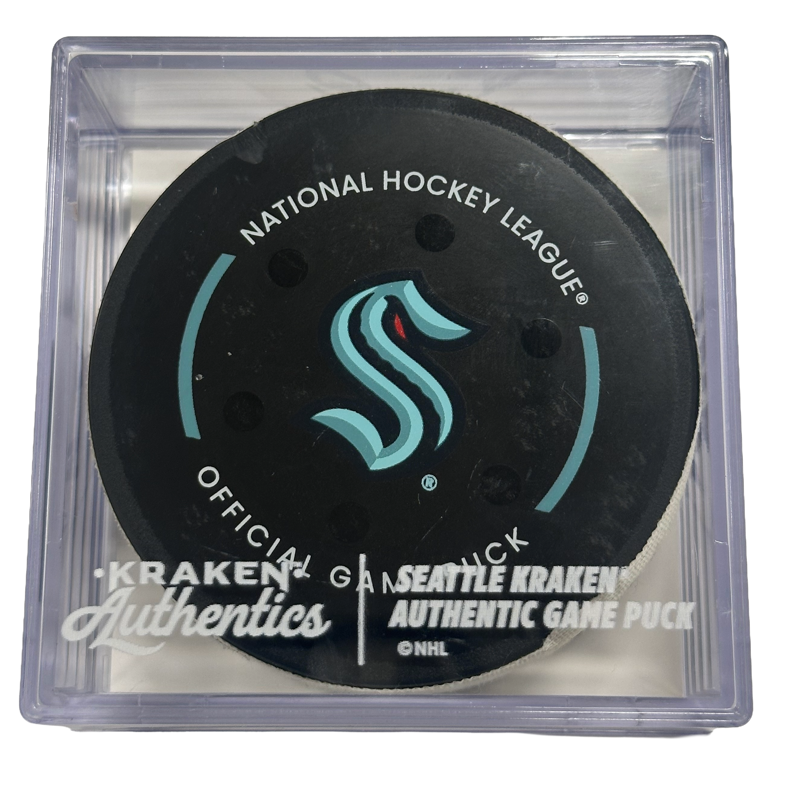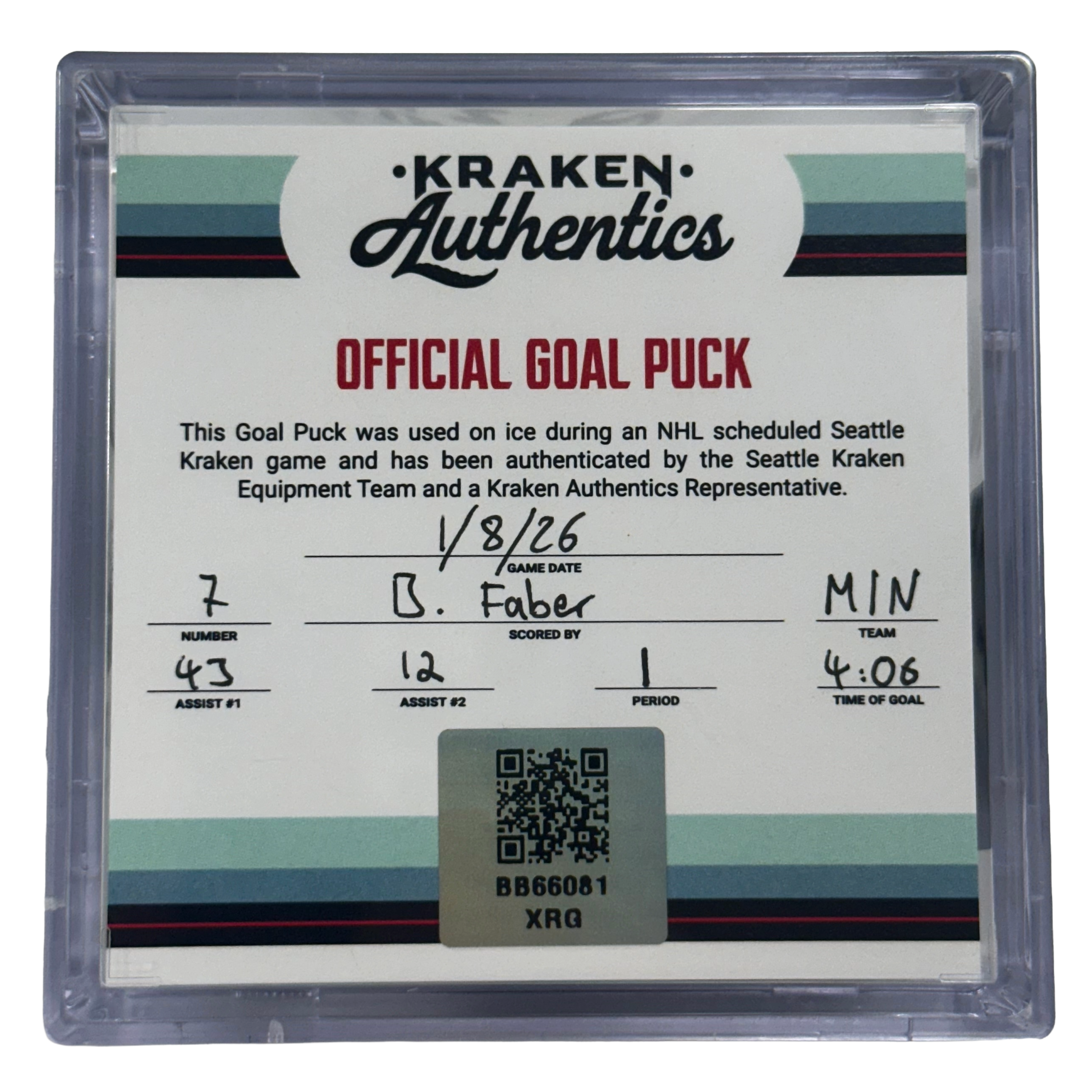 Official game-used goal puck from the Seattle Kraken vs. Minnesota Wild game on January 8, 2026.