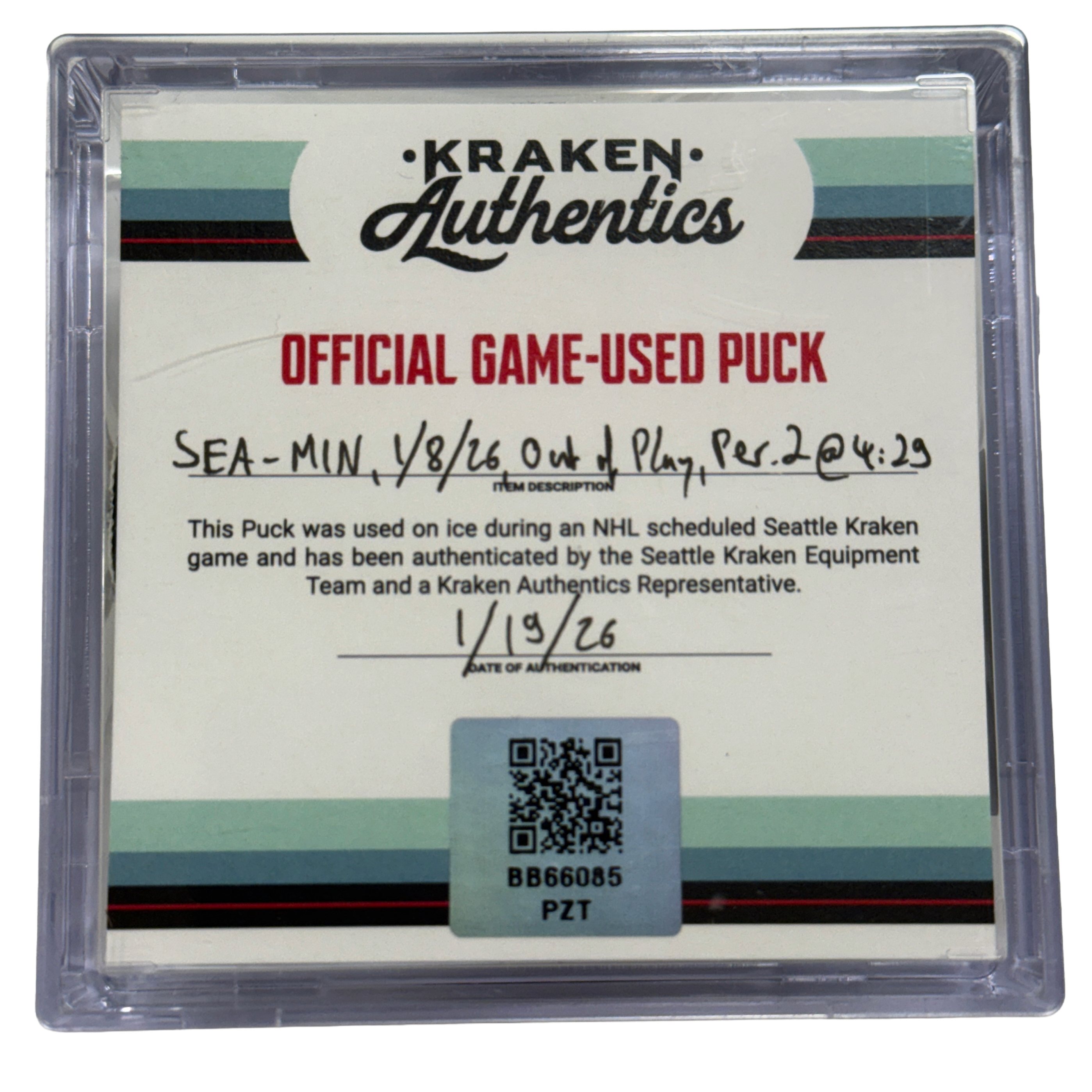 Official game-used puck from the Seattle Kraken vs. Minnesota Wild game on January 8th, 2026. The puck went out of play at 4:29 during the 2nd period and was retrieved directly from the ice.