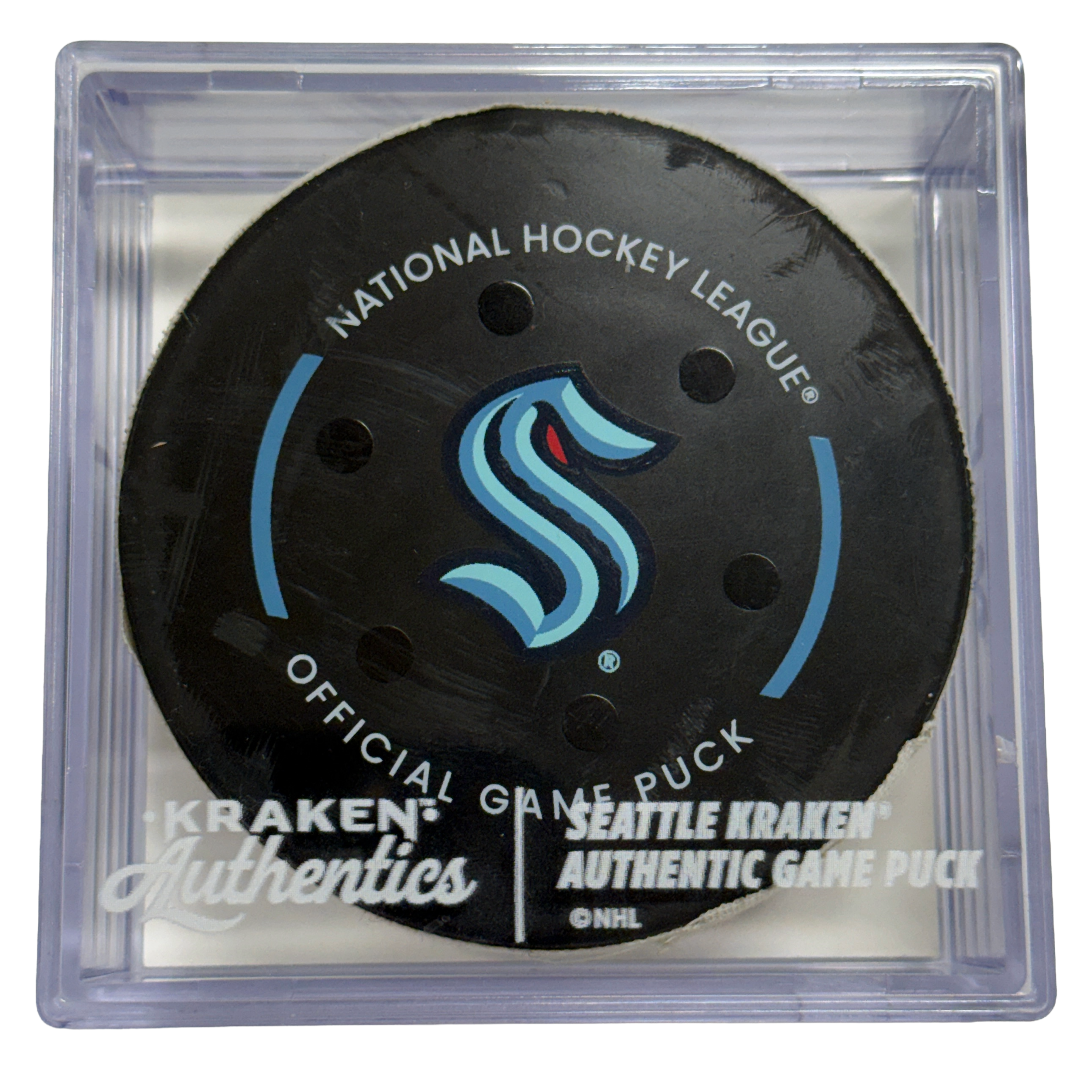 This game-used puck is authenticated by OpSec and includes a Certificate of Authenticity along with a Kraken Authentics puck cube.