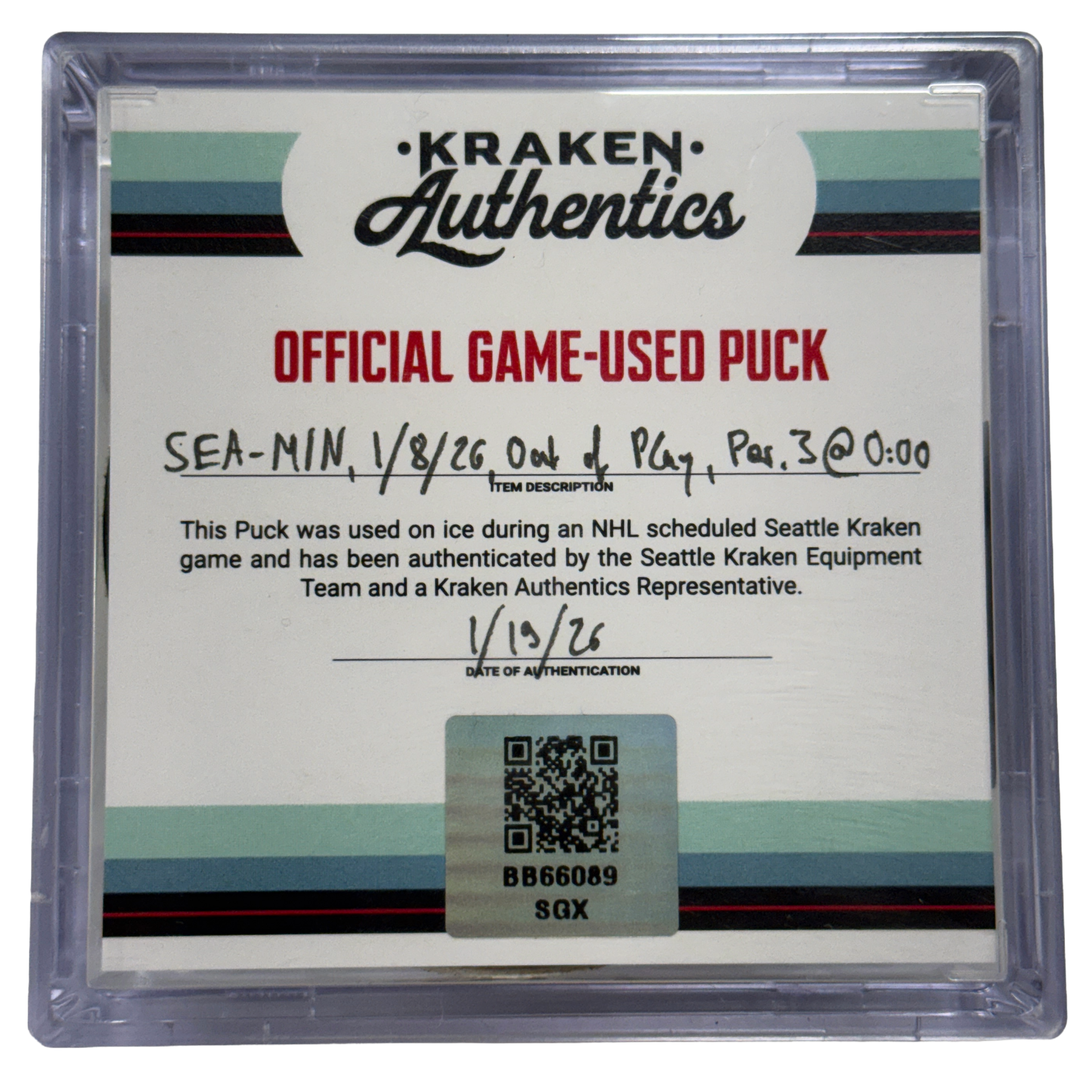 Official game-used puck from the Seattle Kraken vs. Minnesota Wild game on January 8th, 2026. The puck went out of play at the end of the 3rd period and was retrieved directly from the ice.