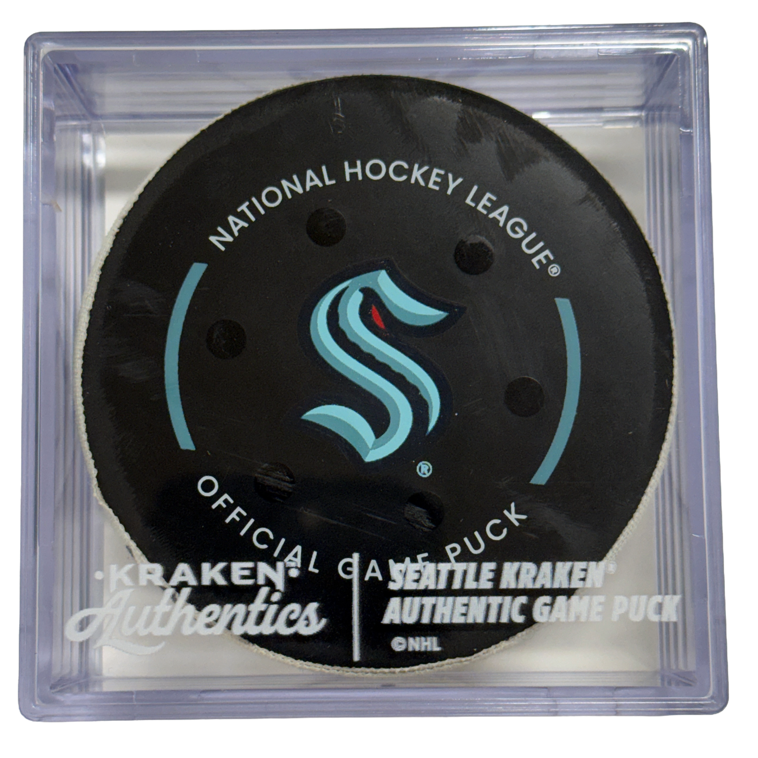 This game-used puck is authenticated by OpSec and includes a Certificate of Authenticity along with a Kraken Authentics puck cube.