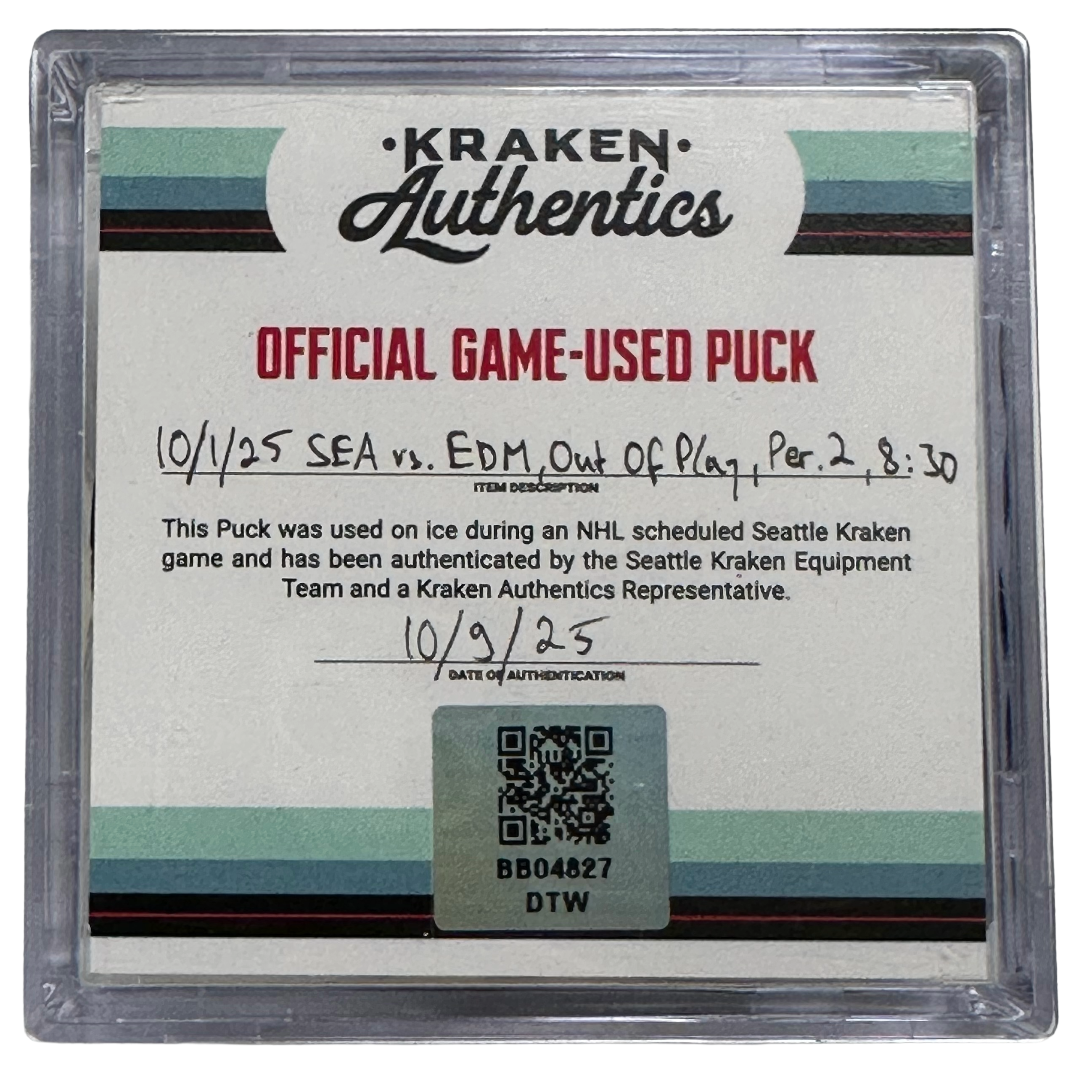 This is an official game-used puck from the Seattle Kraken vs. Edmonton Oilers game on October 1st, 2025. The puck went out of play at 8:30 of the 2nd period and was retrieved directly from the ice.