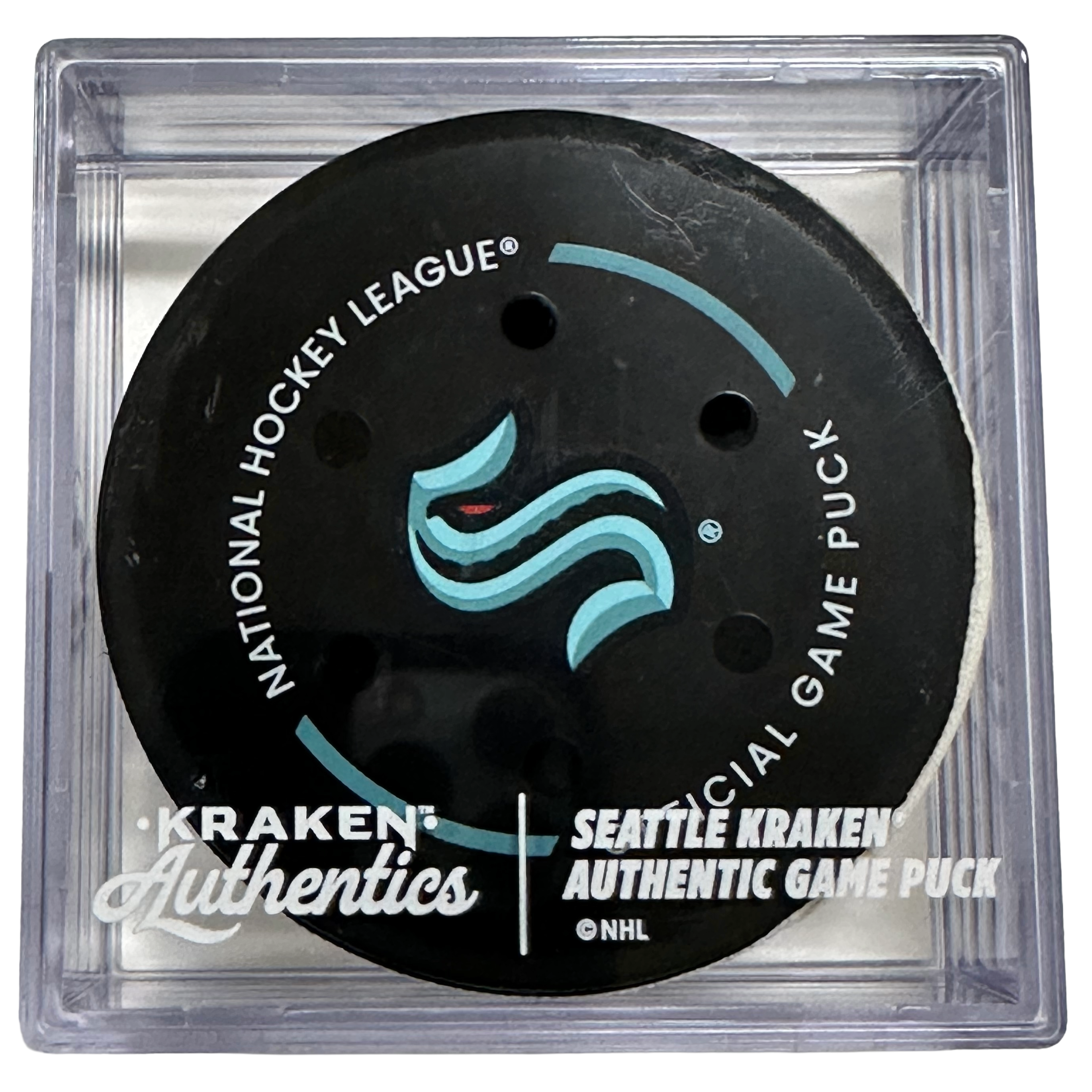 This game-used puck is authenticated by OpSec and includes a Certificate of Authenticity along with a Kraken Authentics puck cube.