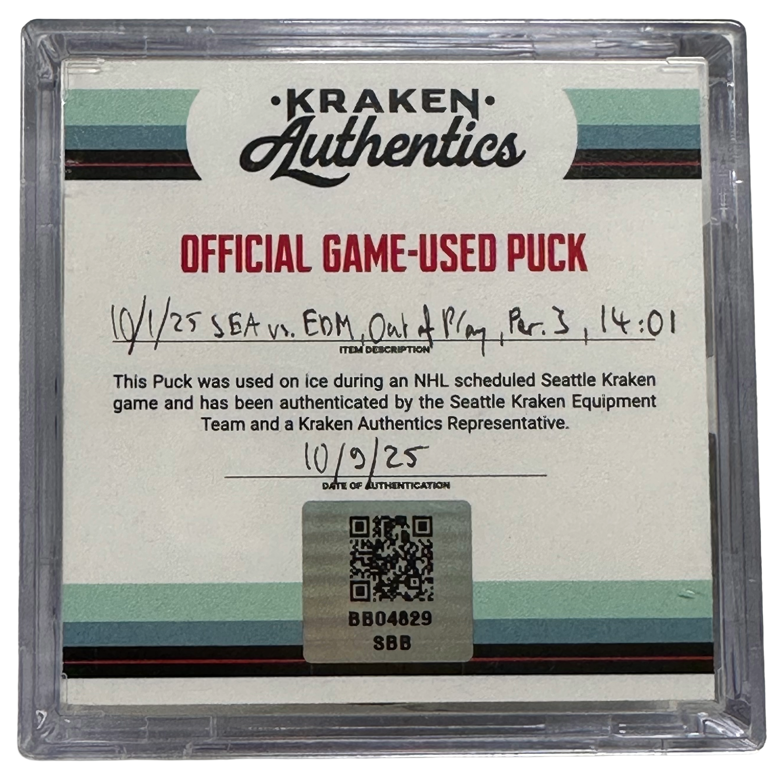 This is an official game-used puck from the Seattle Kraken vs. Edmonton Oilers game on October 1st, 2025. The puck went out of play at 14:01 of the 3rd period and was retrieved directly from the ice.
