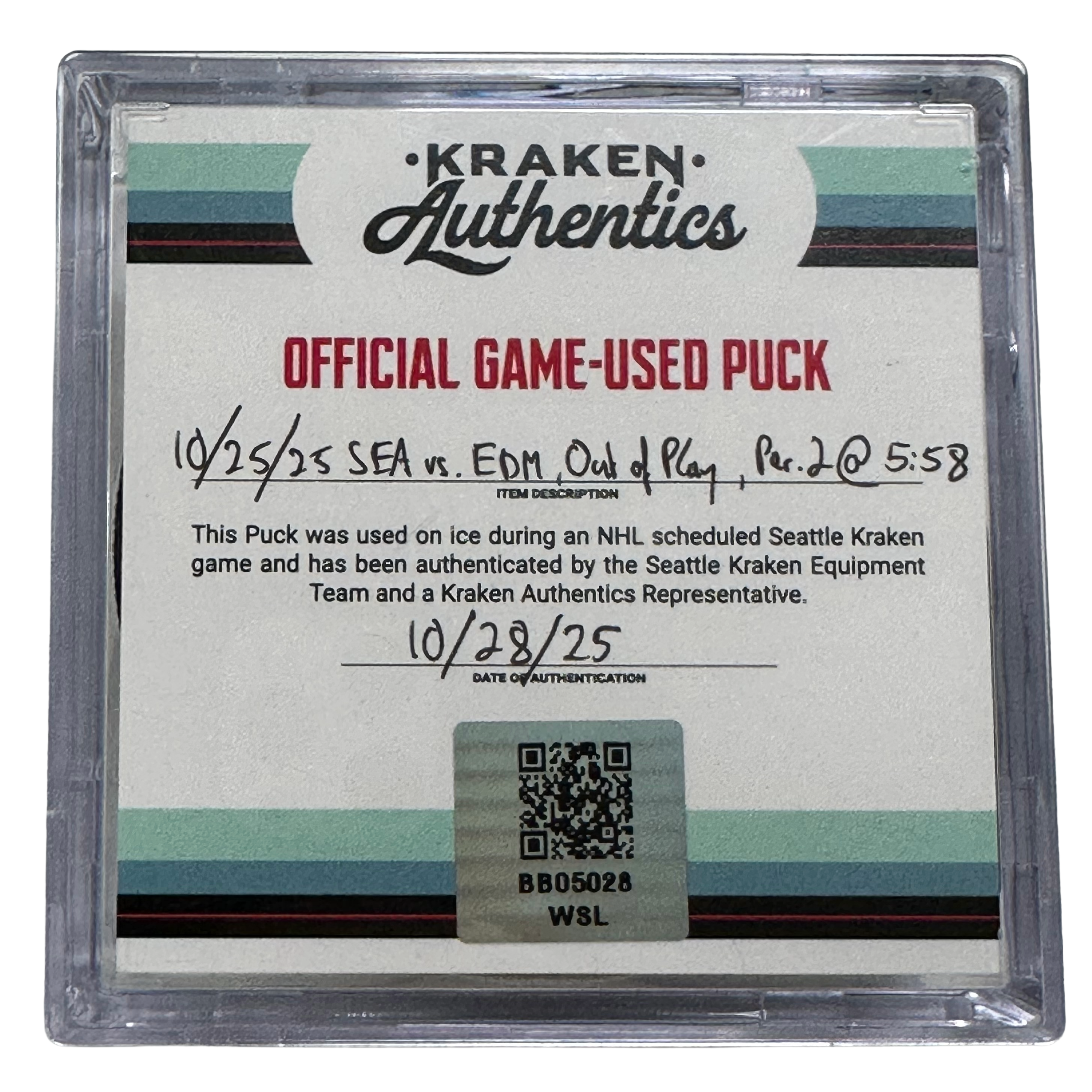 This is an official game-used puck from the Seattle Kraken vs. Edmonton Oilers game on October 25, 2025. The puck went out of play at 5:58 of the 2nd period and was retrieved directly from the ice.
