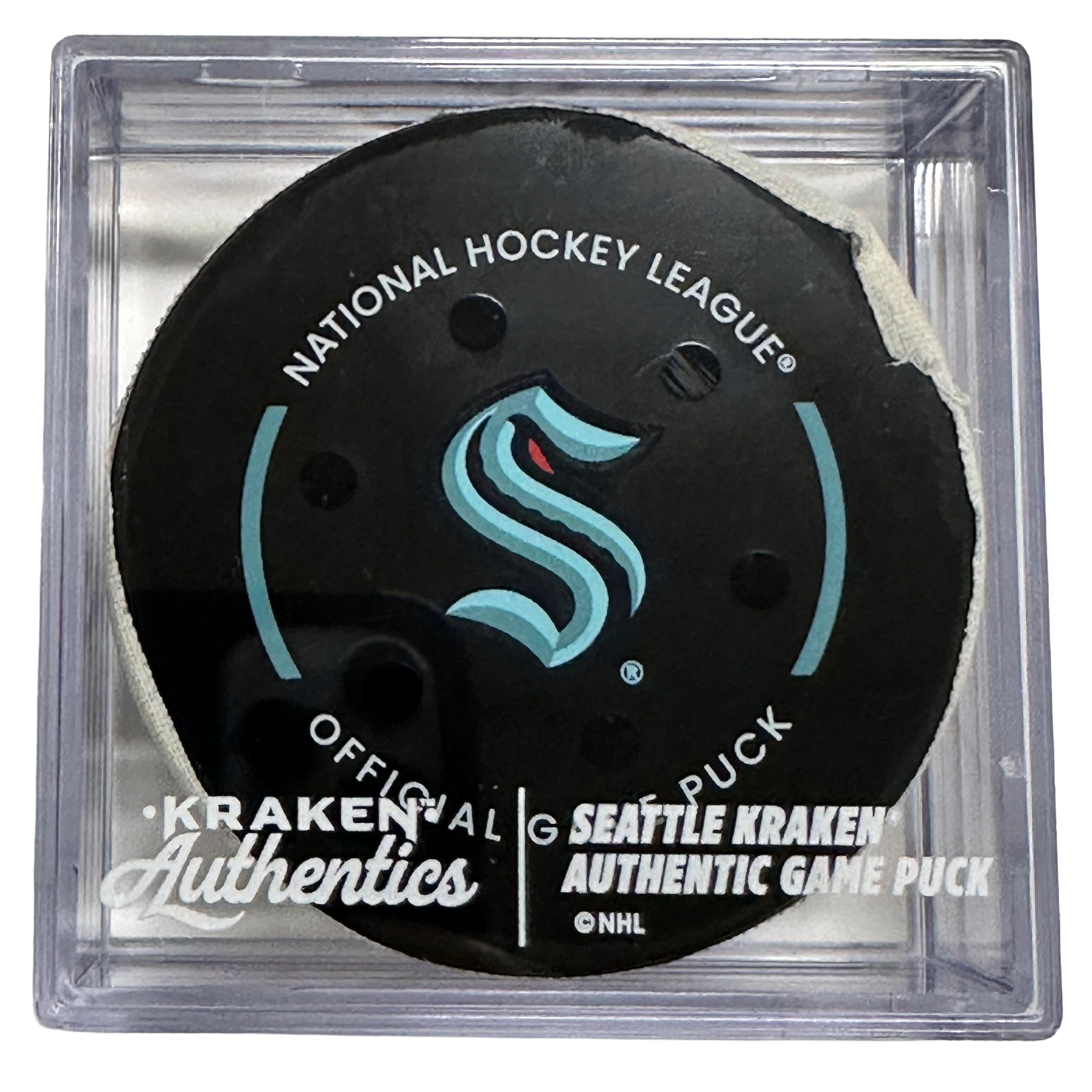 This game-used puck is authenticated by OpSec and includes a Certificate of Authenticity along with a Kraken Authentics puck cube.