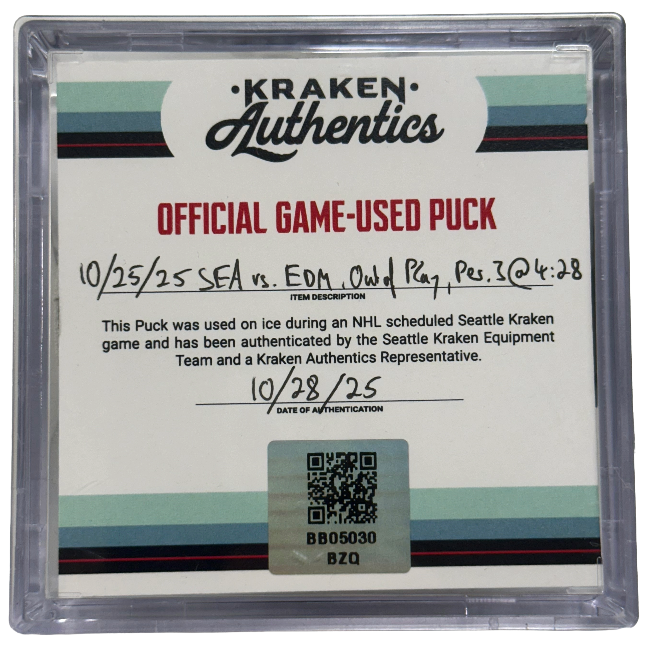 This is an official game-used puck from the Seattle Kraken vs. Edmonton Oilers game on October 25, 2025. The puck went out of play at 4:28 of the 3rd period and was retrieved directly from the ice.