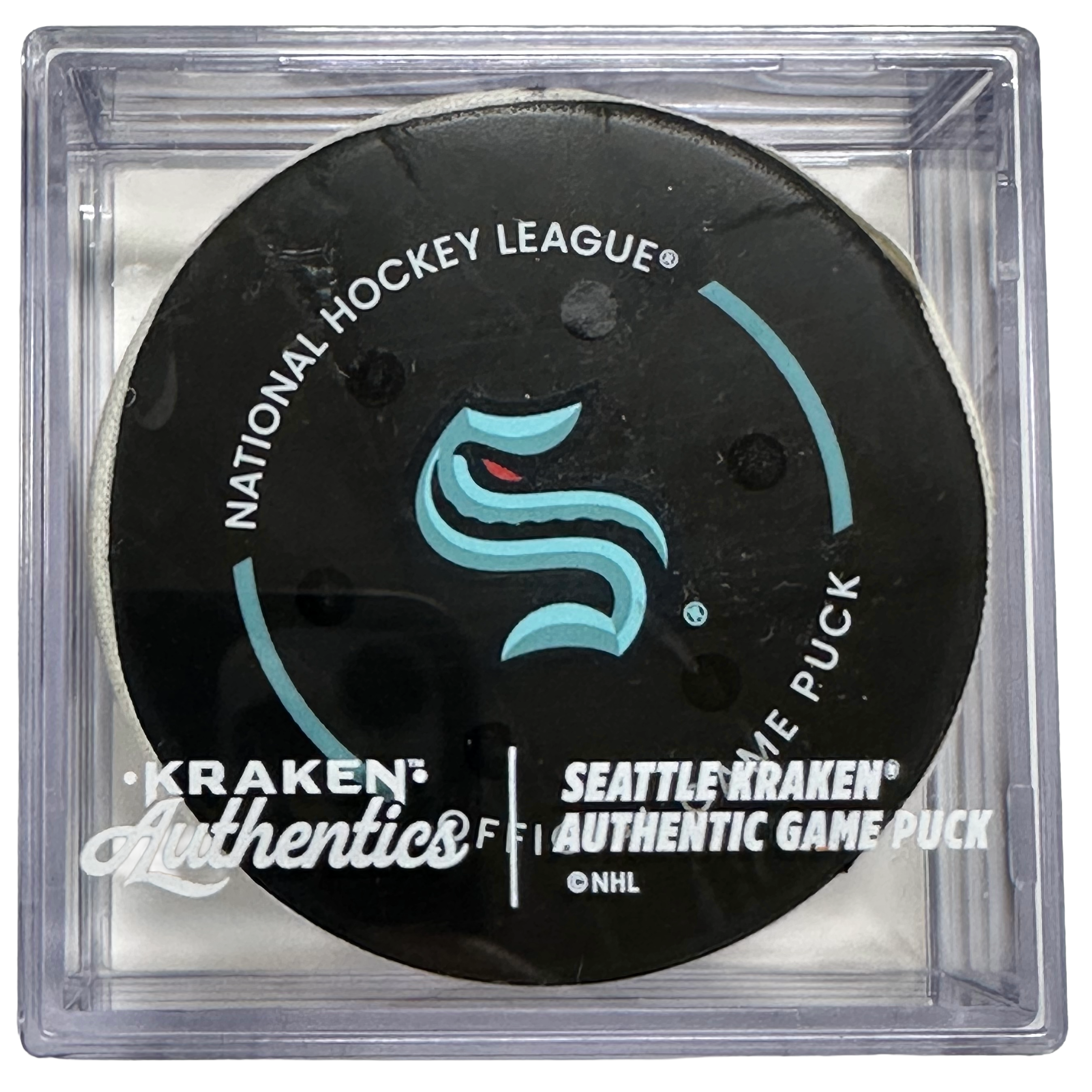 This game-used puck is authenticated by OpSec and includes a Certificate of Authenticity along with a Kraken Authentics puck cube.