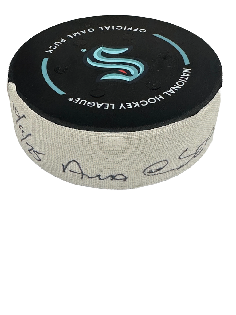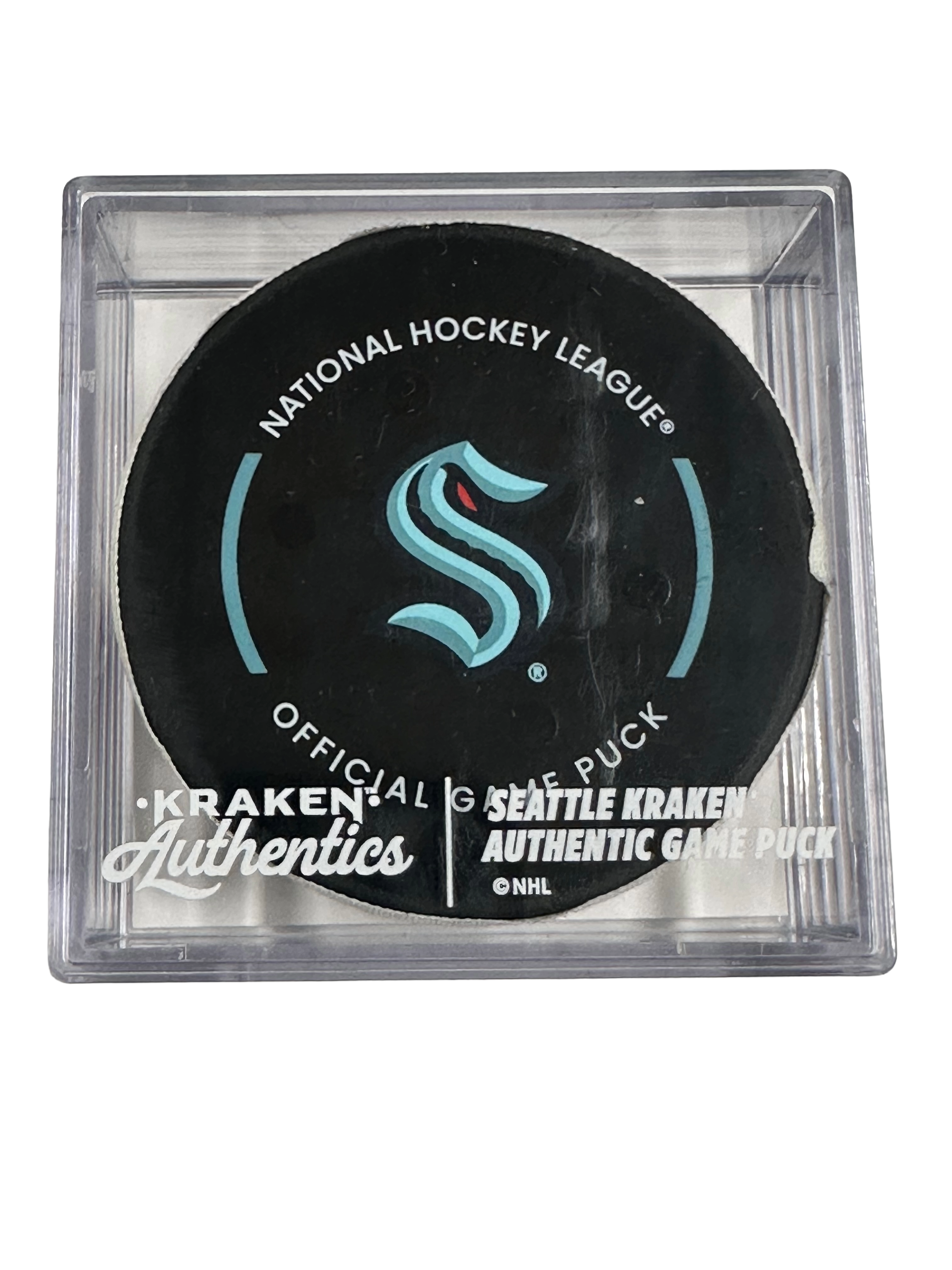 Official game used puck from the Seattle Kraken home opener against the Anaheim Ducks on October 9th, 2025. This puck went out of play in the 2nd period @ 10:16.
