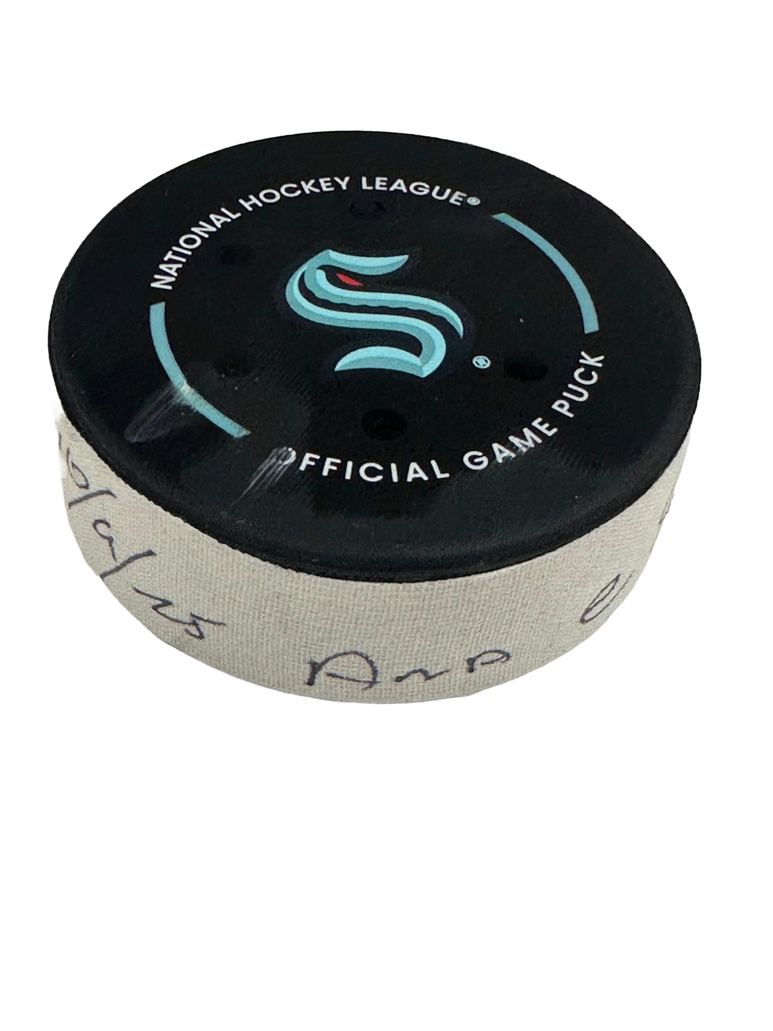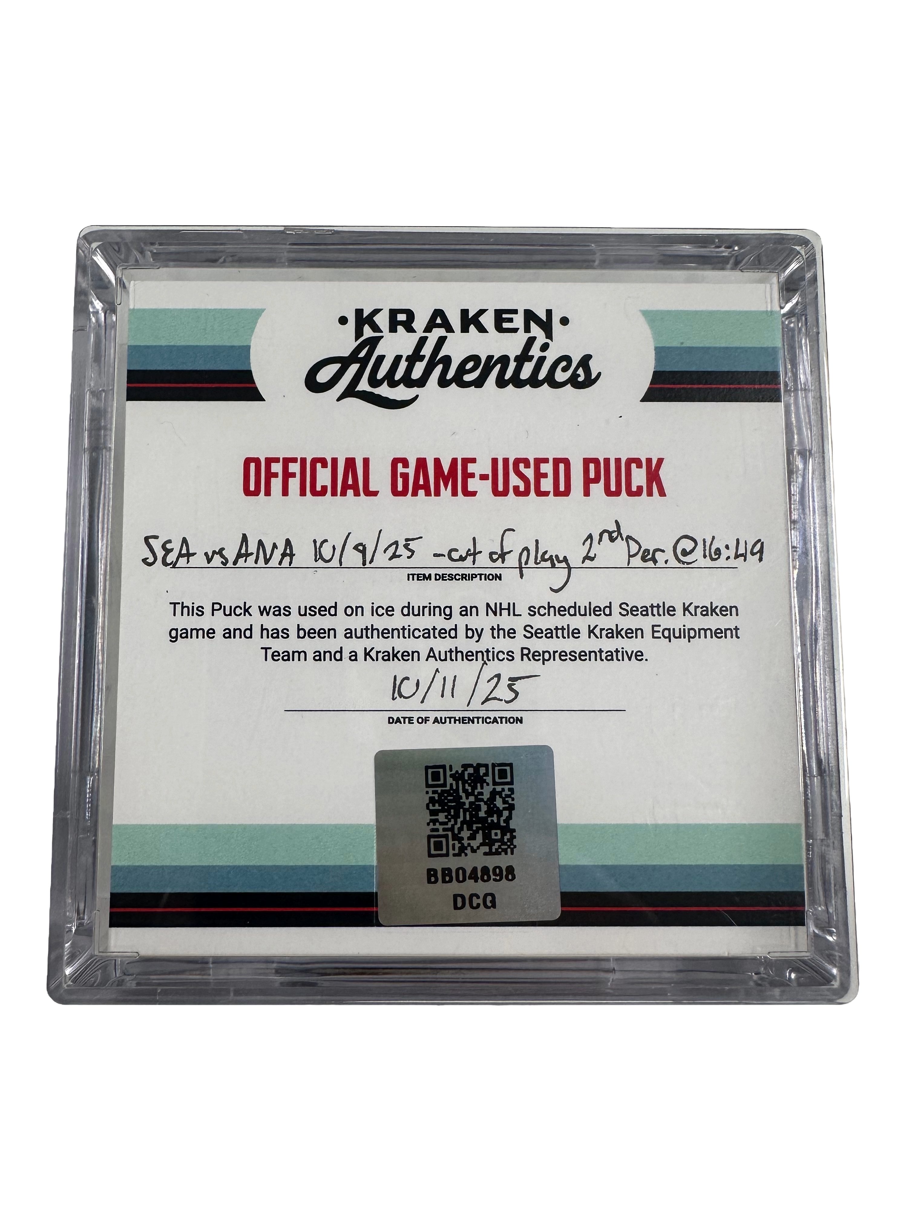 Official game used puck from the Seattle Kraken home opener against the Anaheim Ducks on October 9th, 2025. This puck went out of play in the 2nd period @ 16:49.