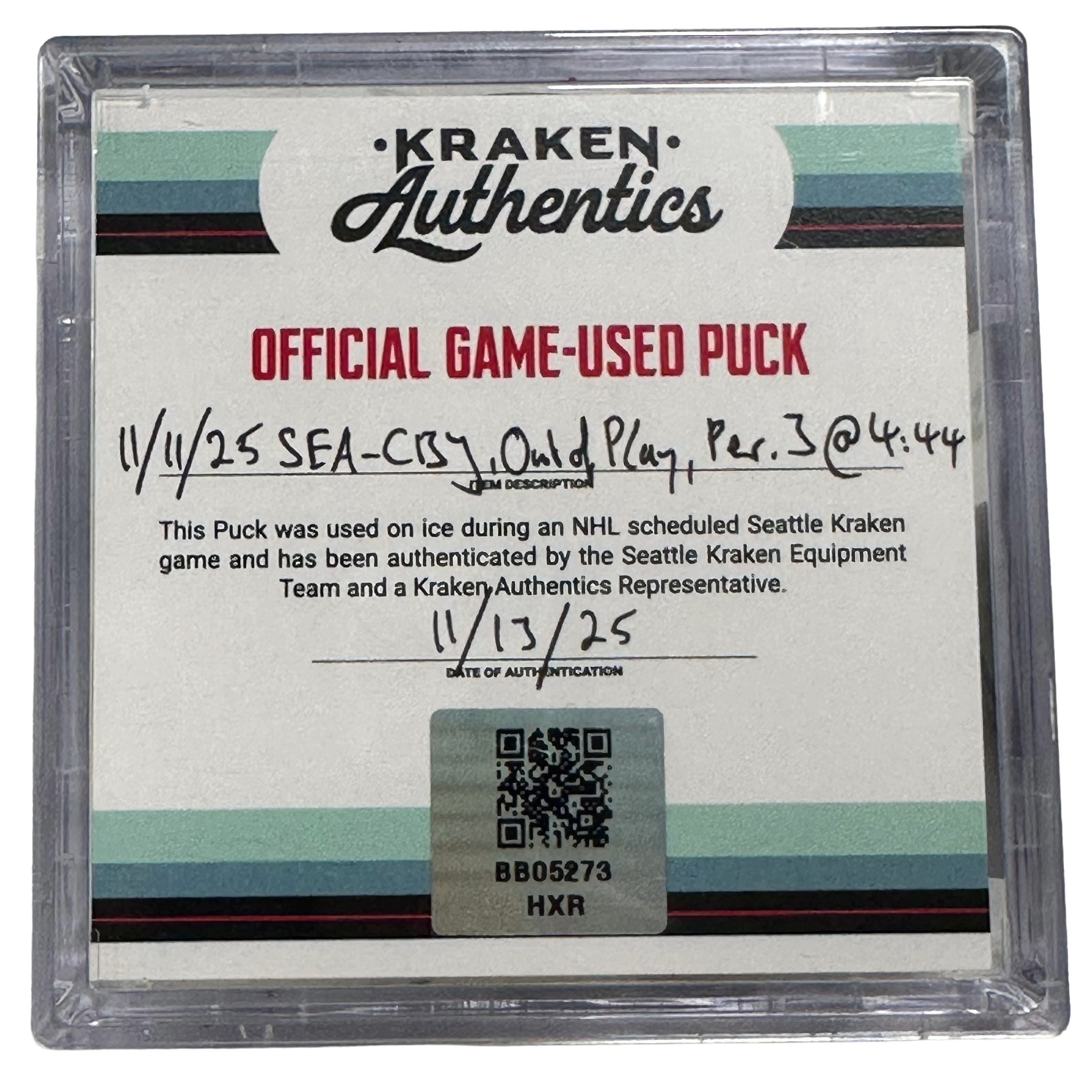Official game-used puck from the Seattle Kraken vs. Columbus Blue Jackets game on November 11, 2025. The puck went out of play at 4:44 of the 3rd period and was retrieved directly from the ice.