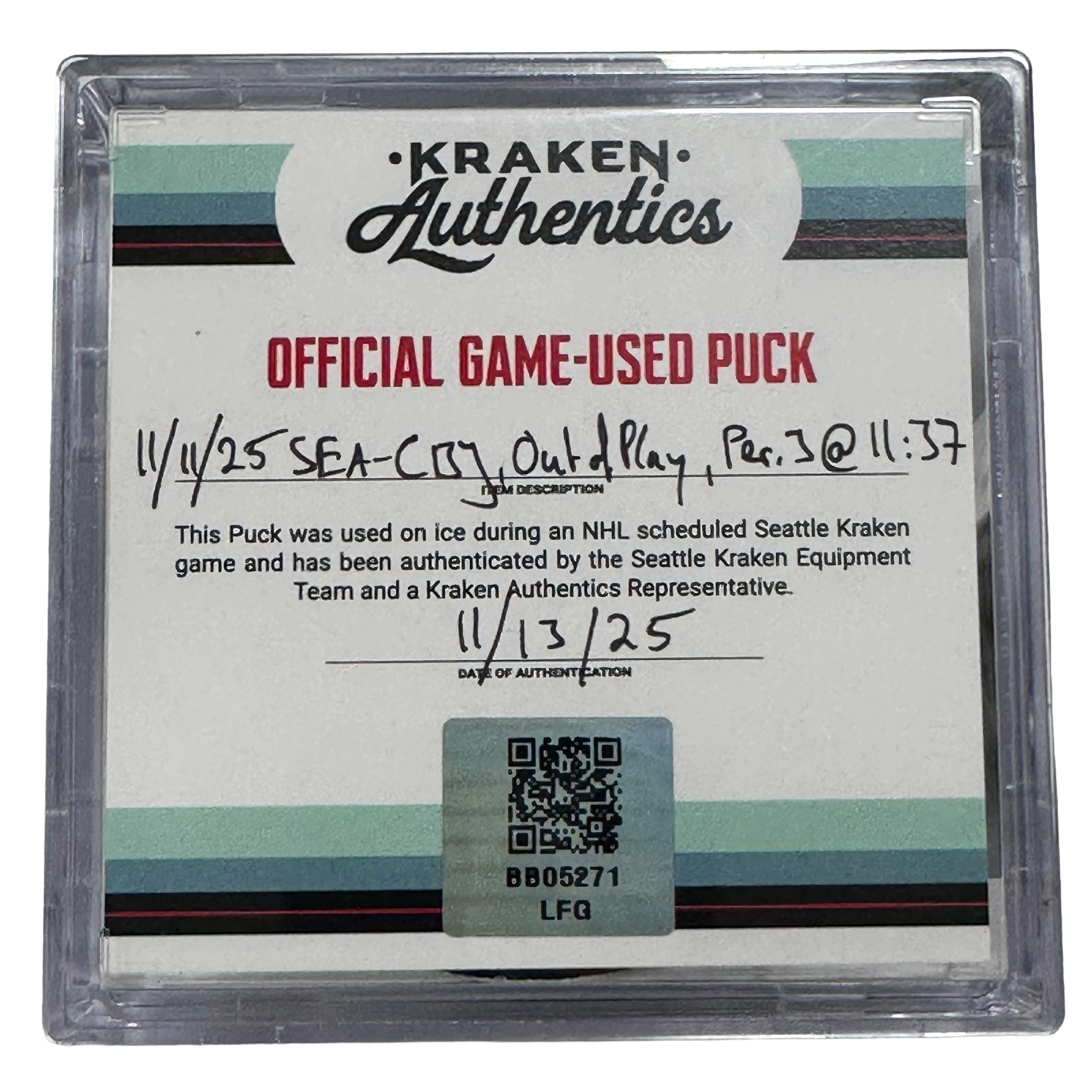 Official game-used puck from the Seattle Kraken vs. Columbus Blue Jackets game on November 11, 2025. The puck went out of play at 11:37 of the 3rd period and was retrieved directly from the ice.