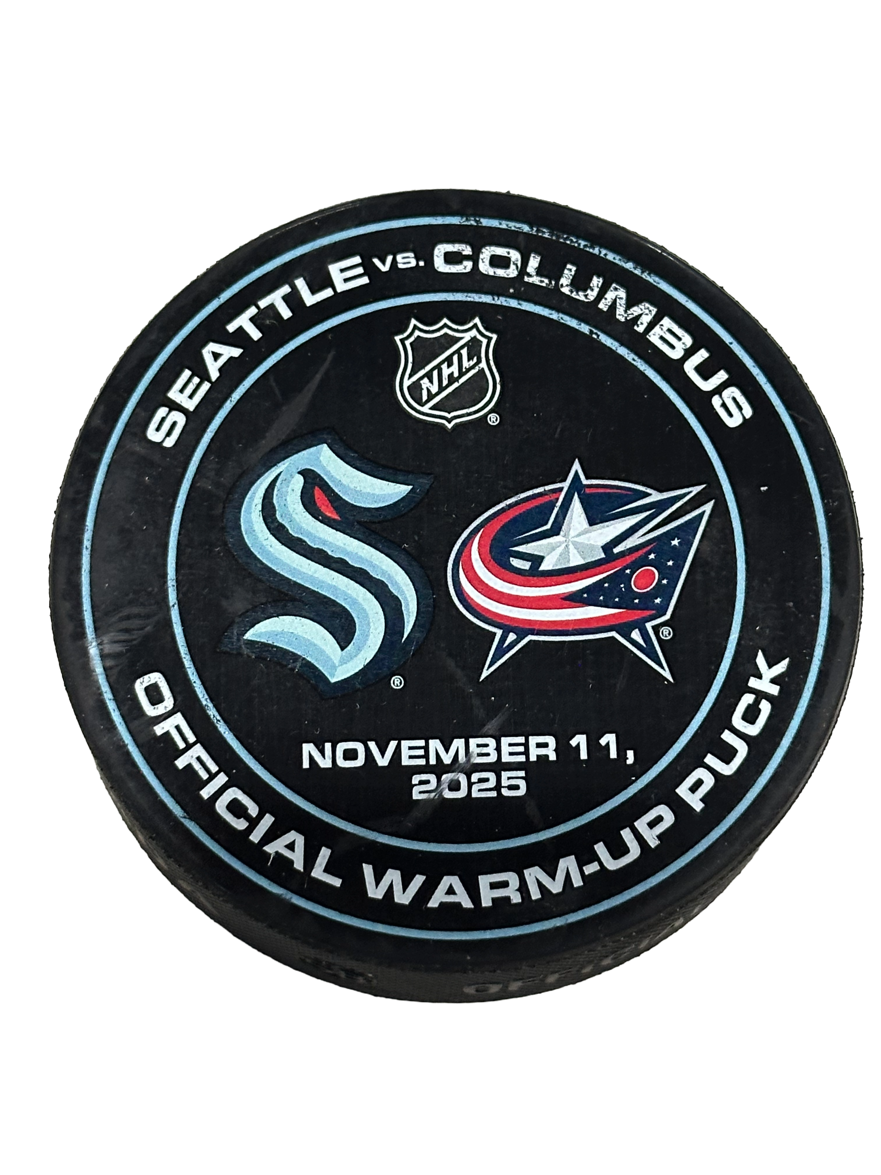 Official warmup puck from the Seattle Kraken’s game against the Columbus Blue Jackets on November 11th, 2025. This high-quality collectible puck is the perfect addition for collectors and Kraken fans looking to own a piece of Kraken history.