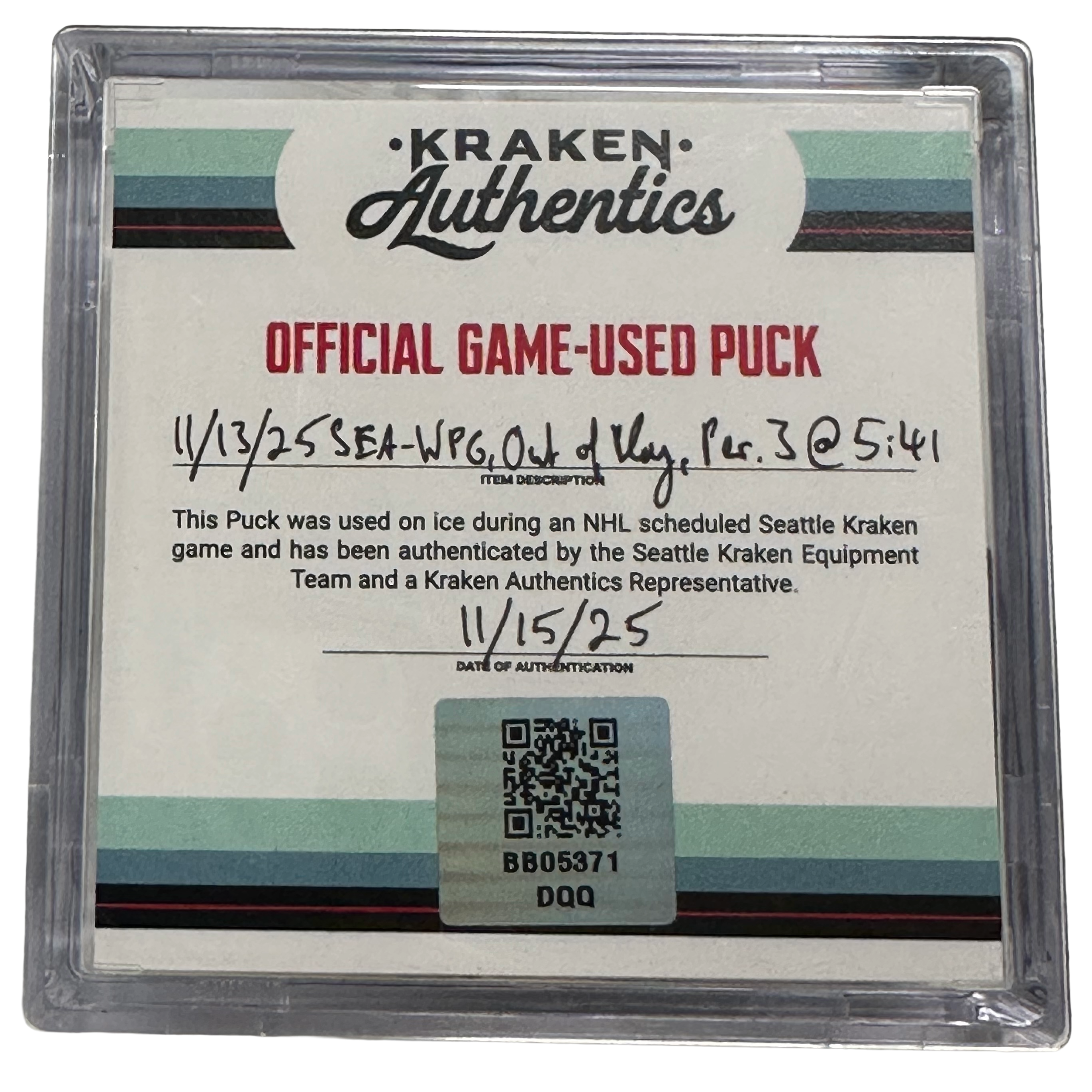 Official game-used puck from the Seattle Kraken vs. Winnipeg Jets game on November 13, 2025. The puck went out of play at 5:41 of the 3rd period and was retrieved directly from the ice.