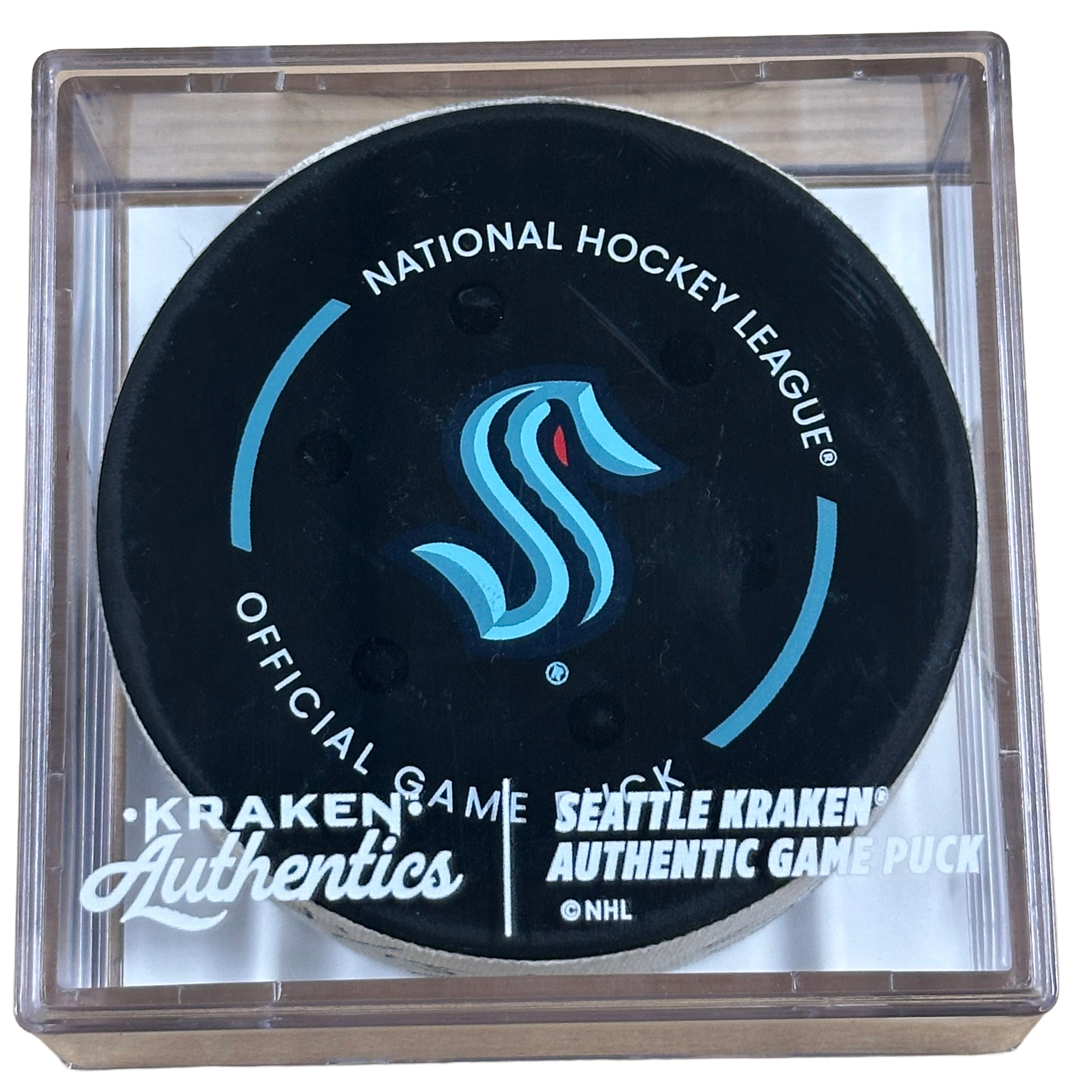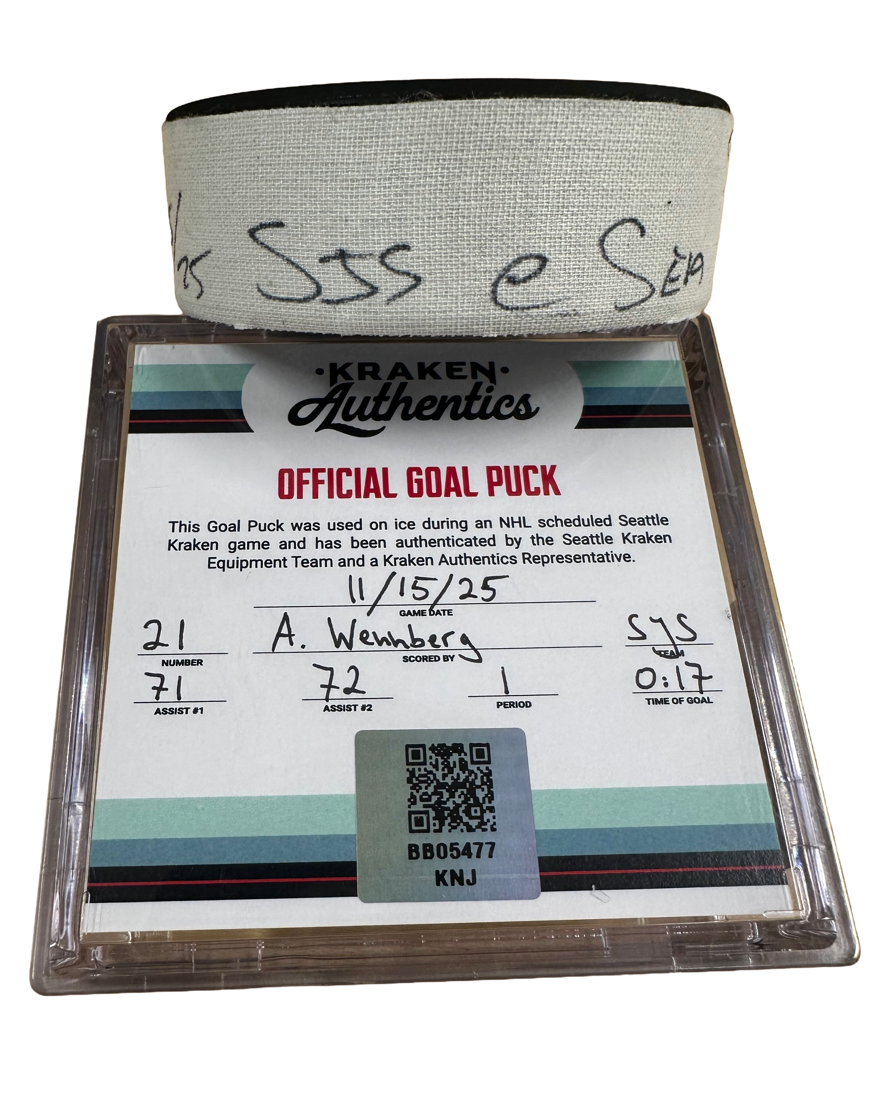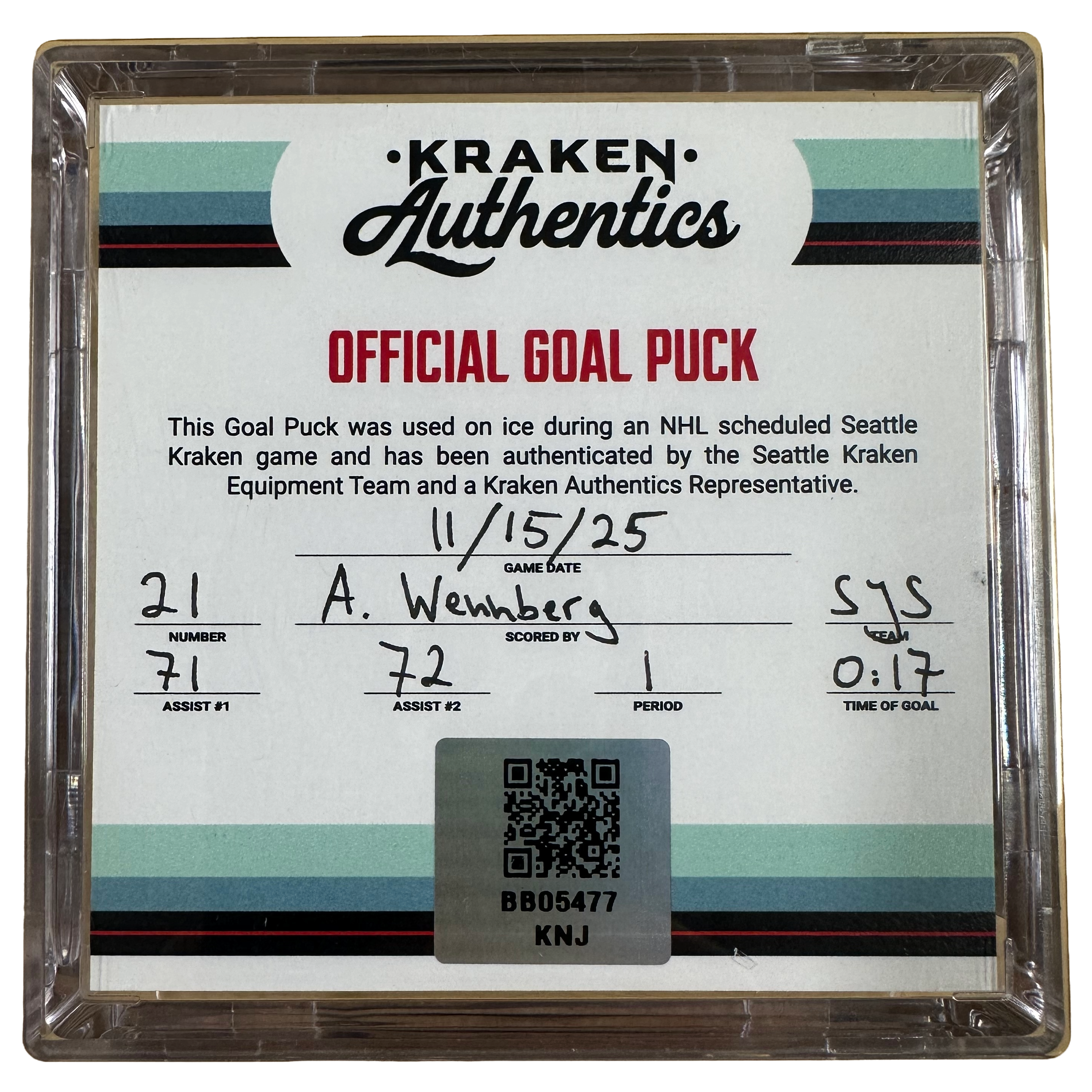 This is the official game-used goal puck from the Seattle Kraken vs. San Jose Sharks game on November 15, 2025. This puck was used to score Alex Wennberg’s goal at 00:17 of the 1st period, assisted by Macklin Celebrini and William Eklund.