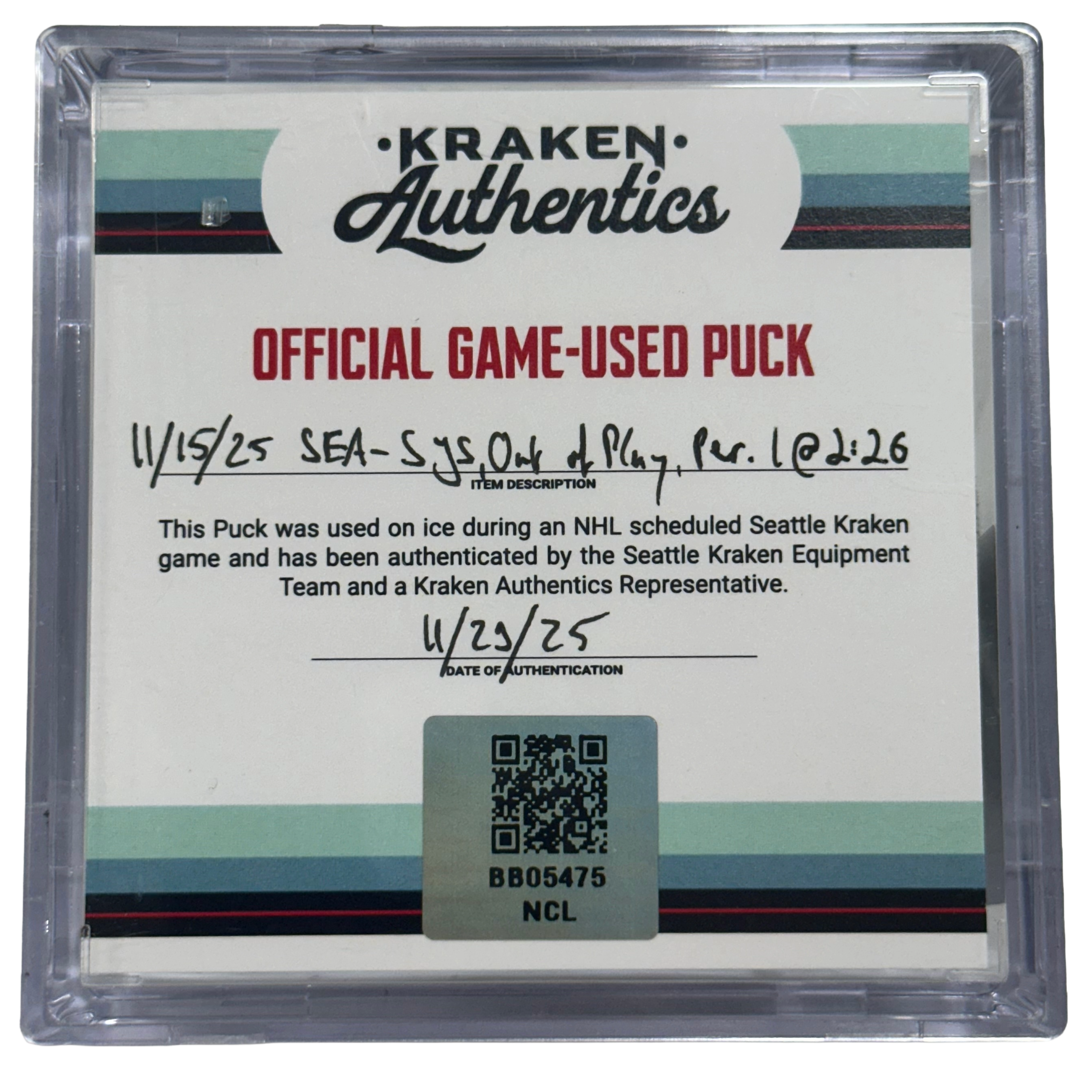 Official game-used puck from the Seattle Kraken vs. San Jose Sharks game on November 15, 2025. The puck went out of play at 2:26 of the 1st period and was retrieved directly from the ice.