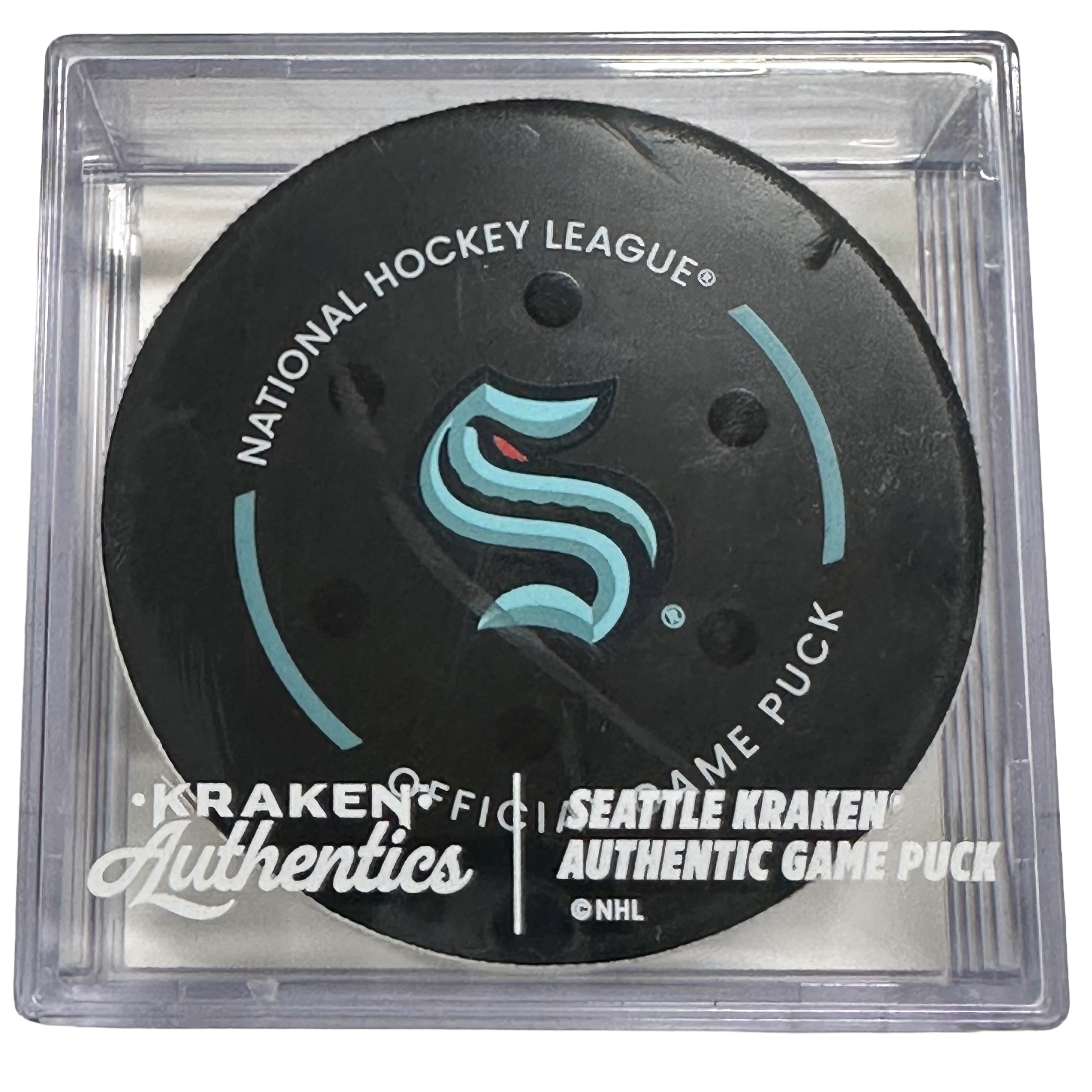 This game-used puck is authenticated by OpSec and includes a Certificate of Authenticity along with a Kraken Authentics puck cube.