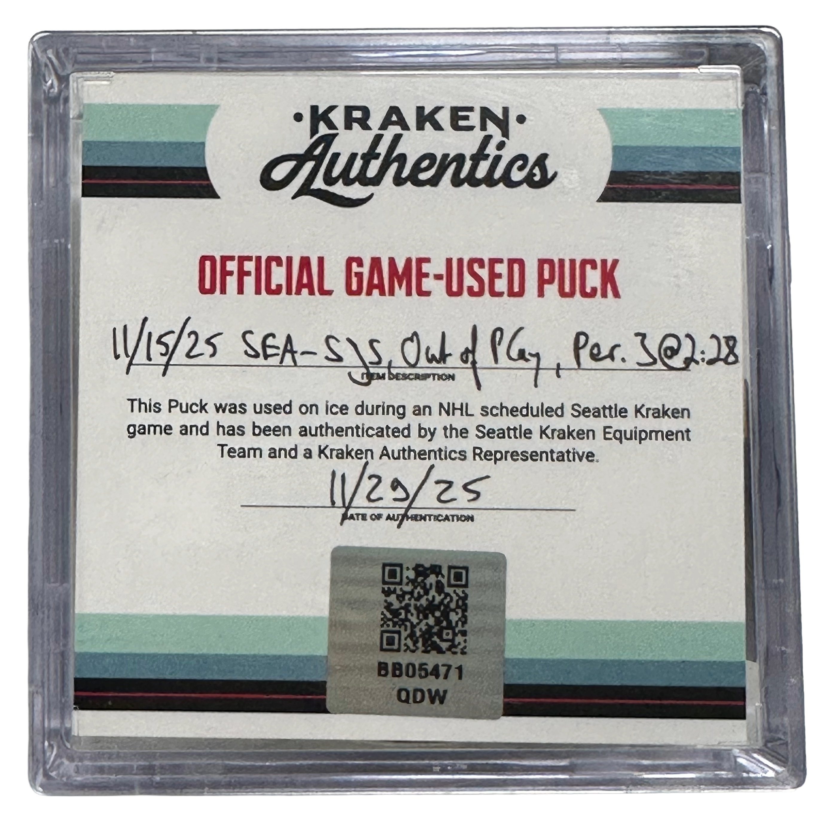 Official game-used puck from the Seattle Kraken vs. San Jose Sharks game on November 15, 2025. The puck went out of play at 2:28 of the 3rd period and was retrieved directly from the ice.