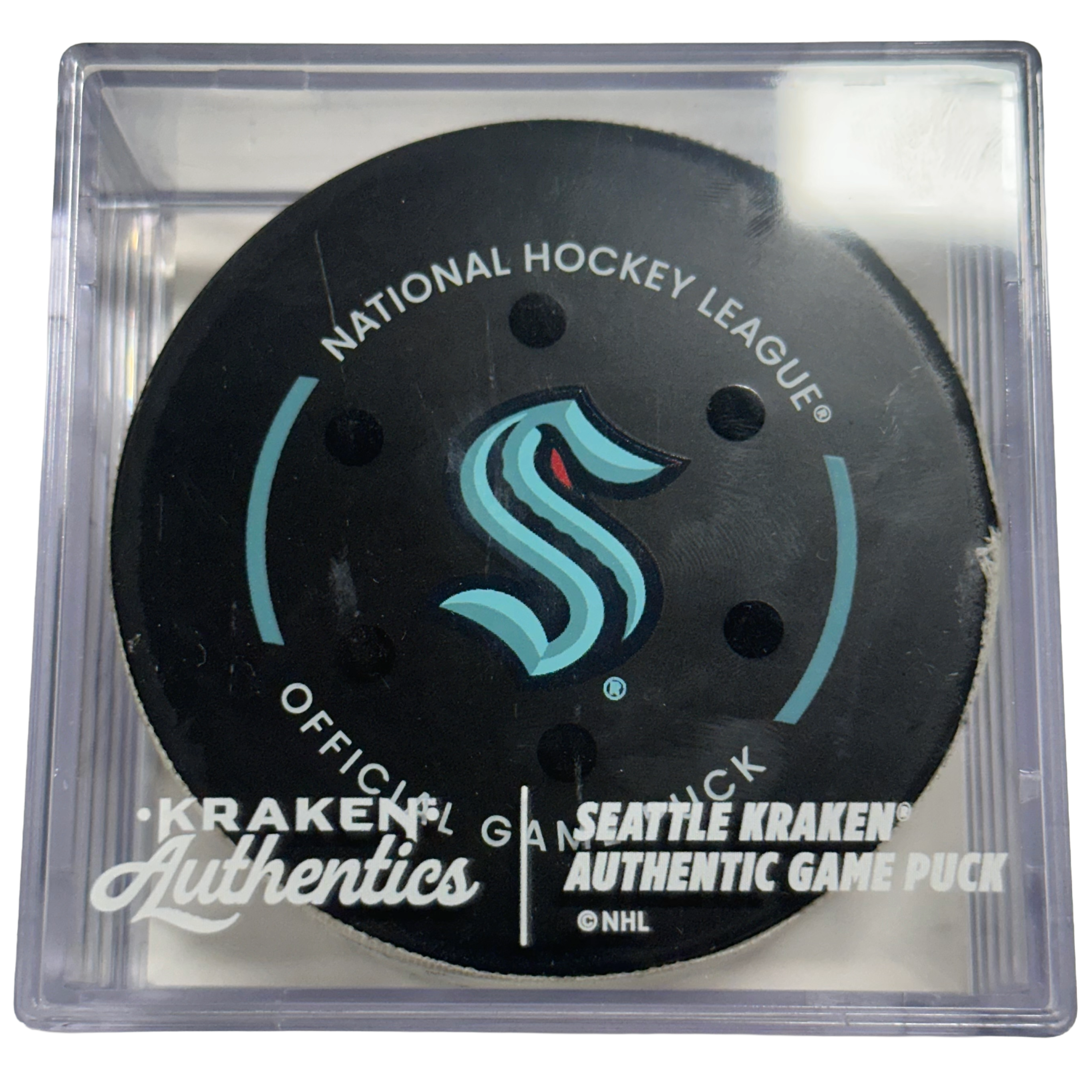 This game-used puck is authenticated by OpSec and includes a Certificate of Authenticity along with a Kraken Authentics puck cube.