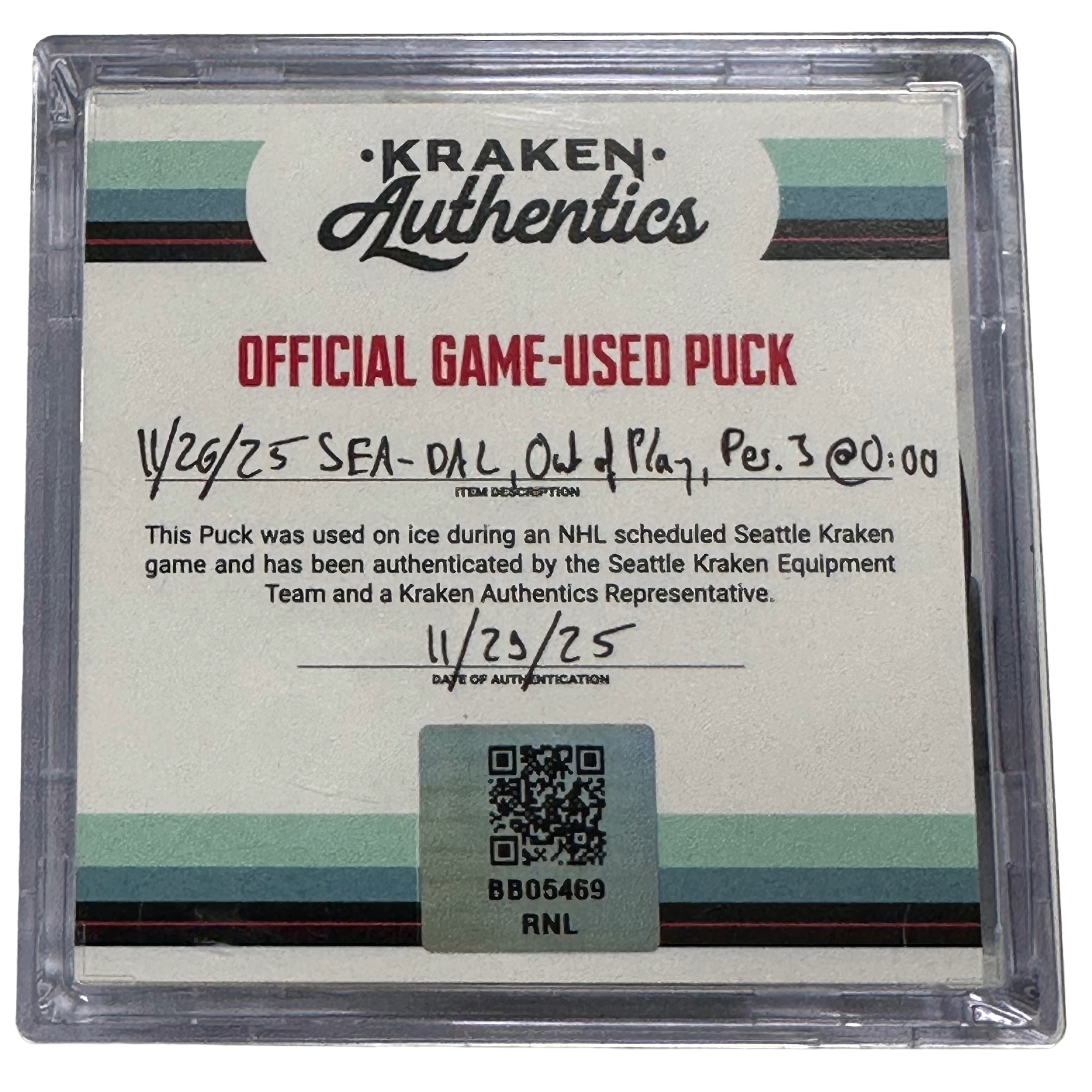 Official game-used puck from the Seattle Kraken vs. Dallas Stars game on November 26, 2025. The puck went out of play at 0:00 of the 3rd period and was retrieved directly from the ice.