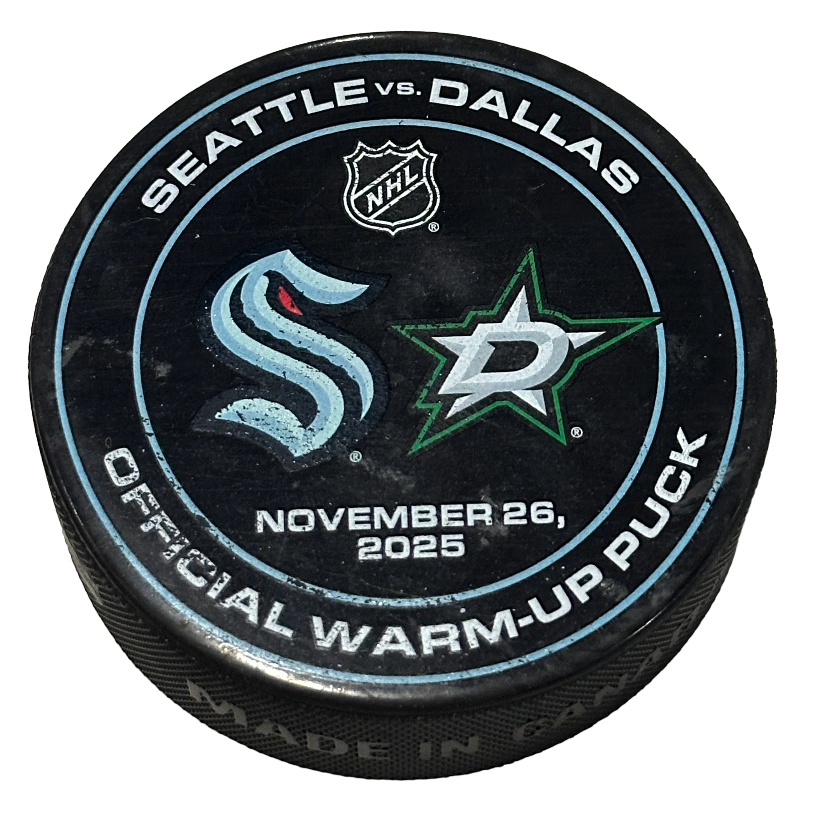 Official warmup puck from the Seattle Kraken’s game against the Dallas Stars on November 26th, 2025. This high-quality collectible puck is the perfect addition for collectors and Kraken fans looking to own a piece of Kraken history.