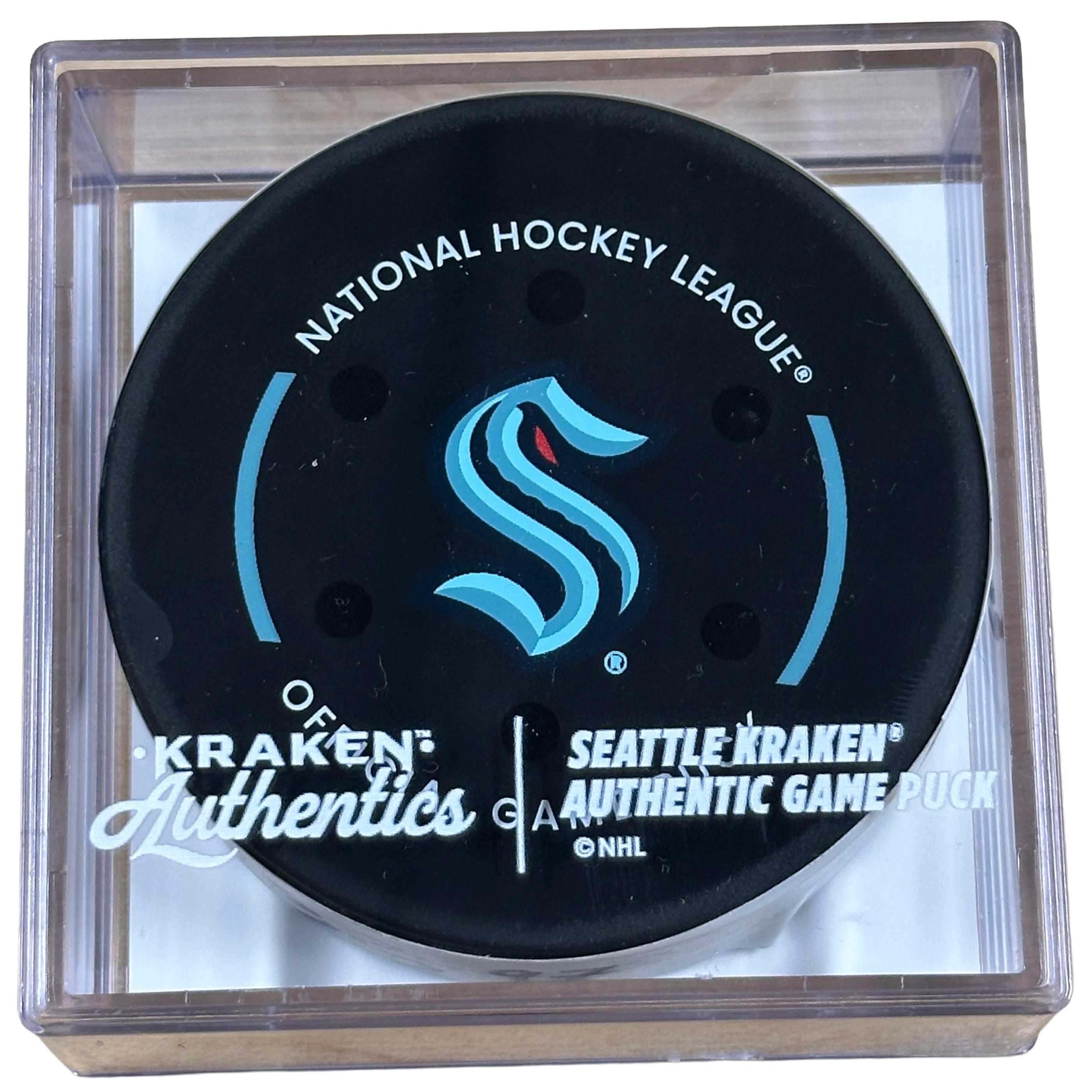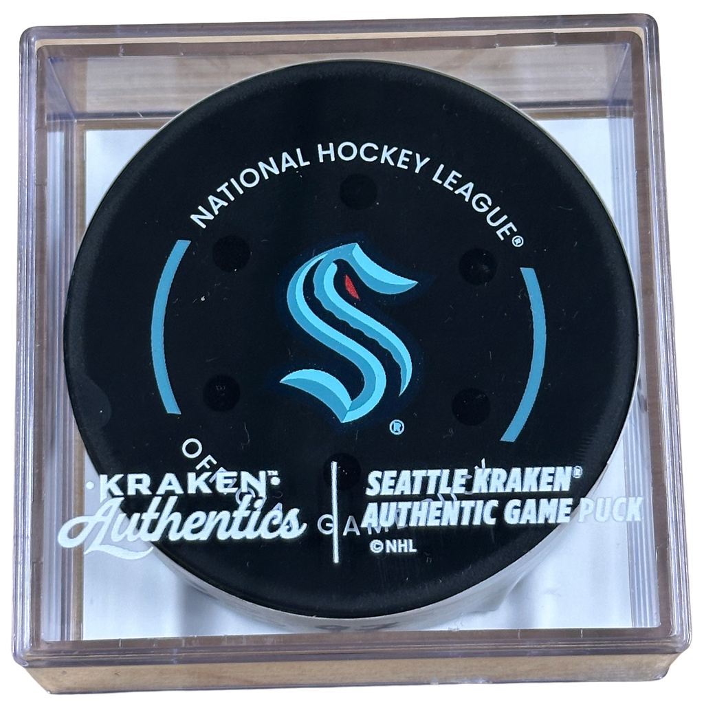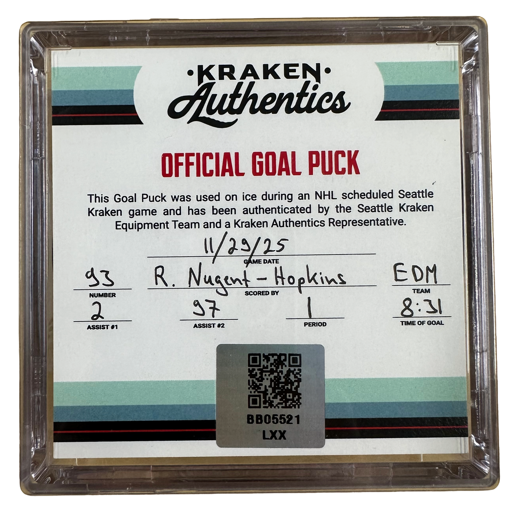 This is the official game-used goal puck from the Seattle Kraken vs. Edmonton Oilers game on November 29, 2025. This puck was the one used to score Ryan Nugent-Hopkins’ 6th goal of the 2025–26 season, a power-play goal at 11:29 of the 1st period.