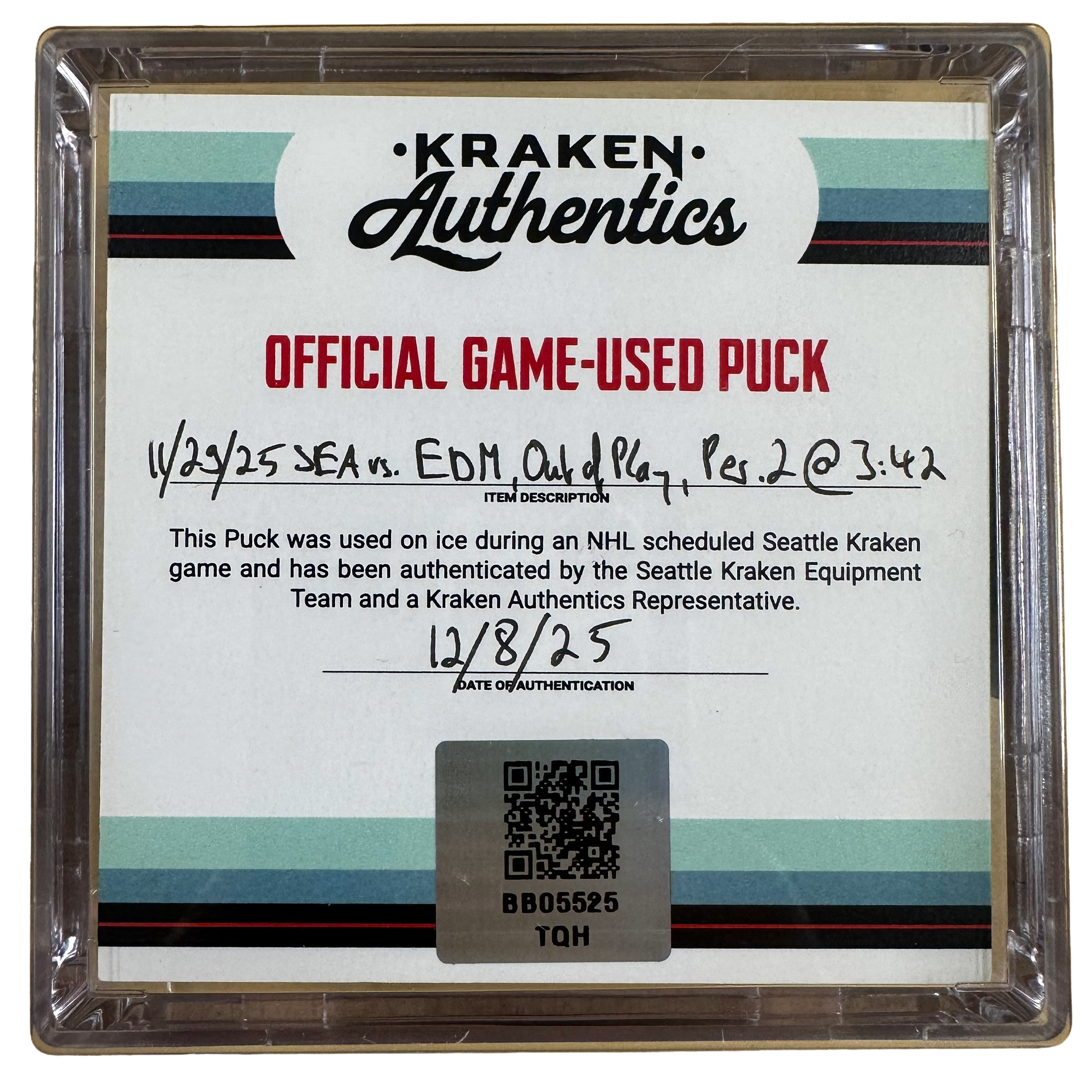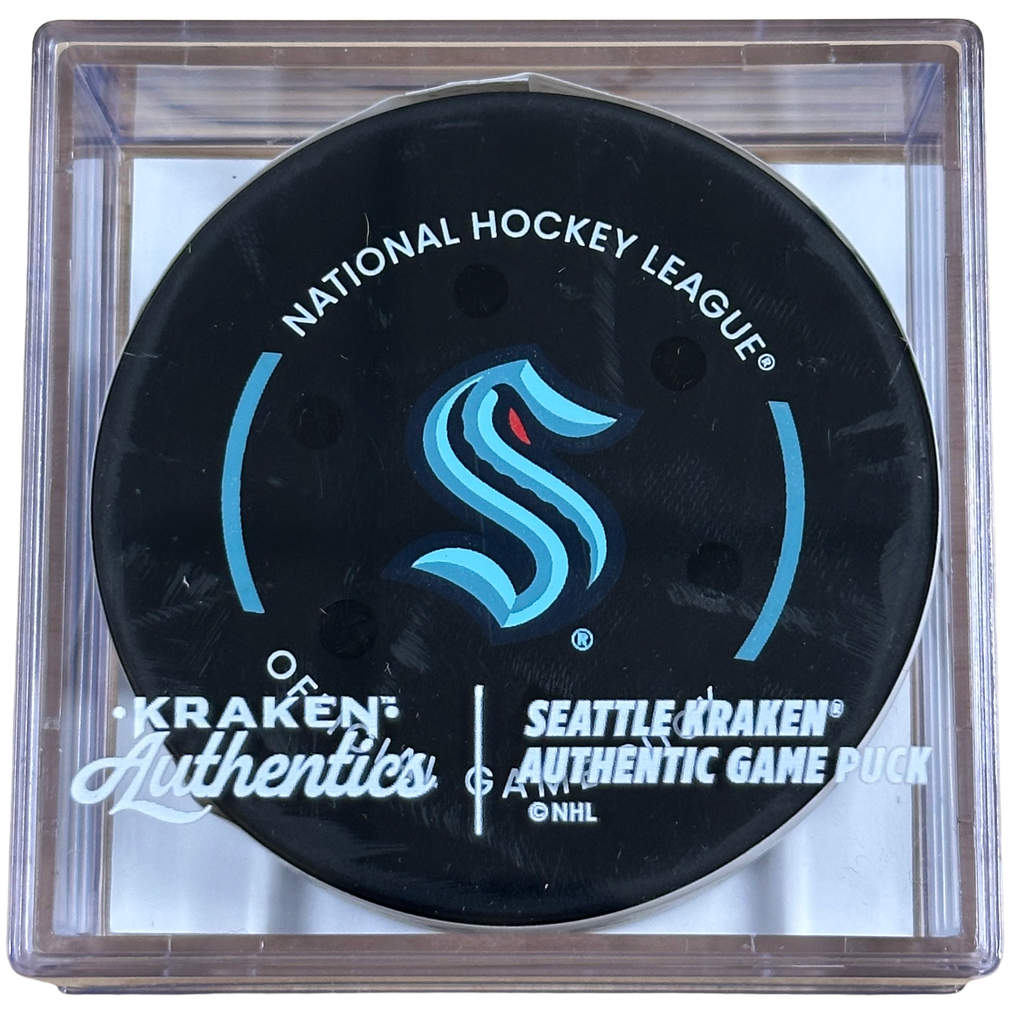 This is an official game-used puck from the Seattle Kraken vs. Edmonton Oilers game on November 29, 2025. This puck went out of play at 3:42 of the 2nd period and was retrieved directly from the ice.