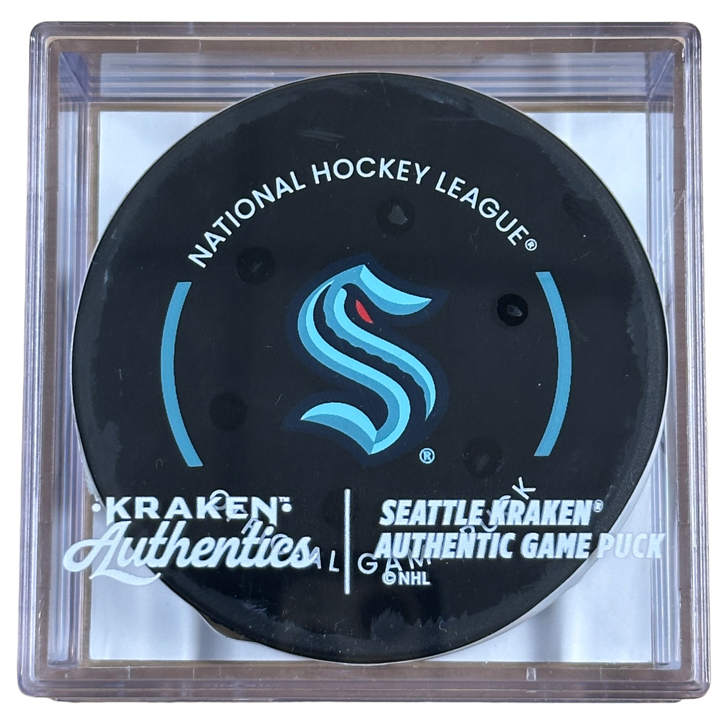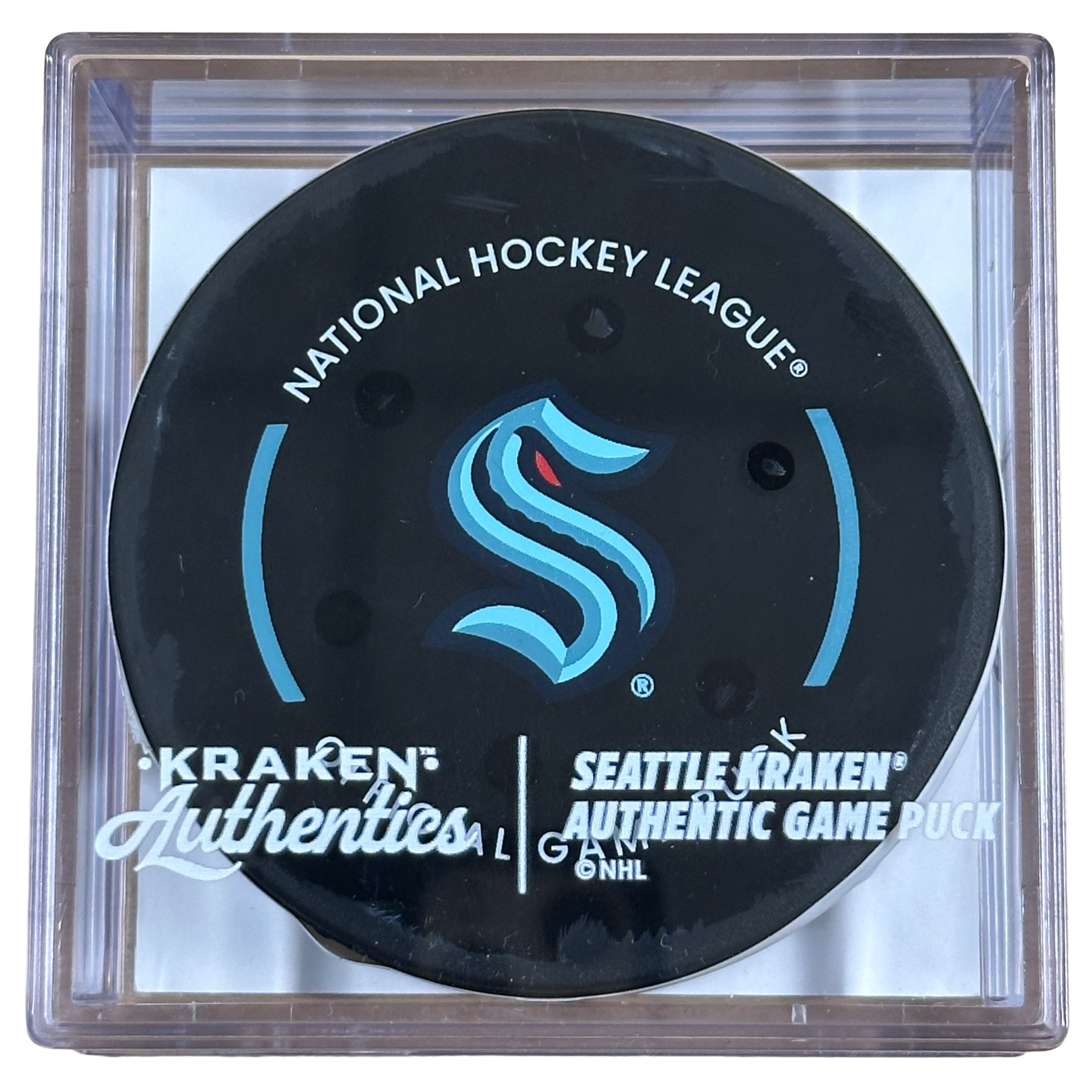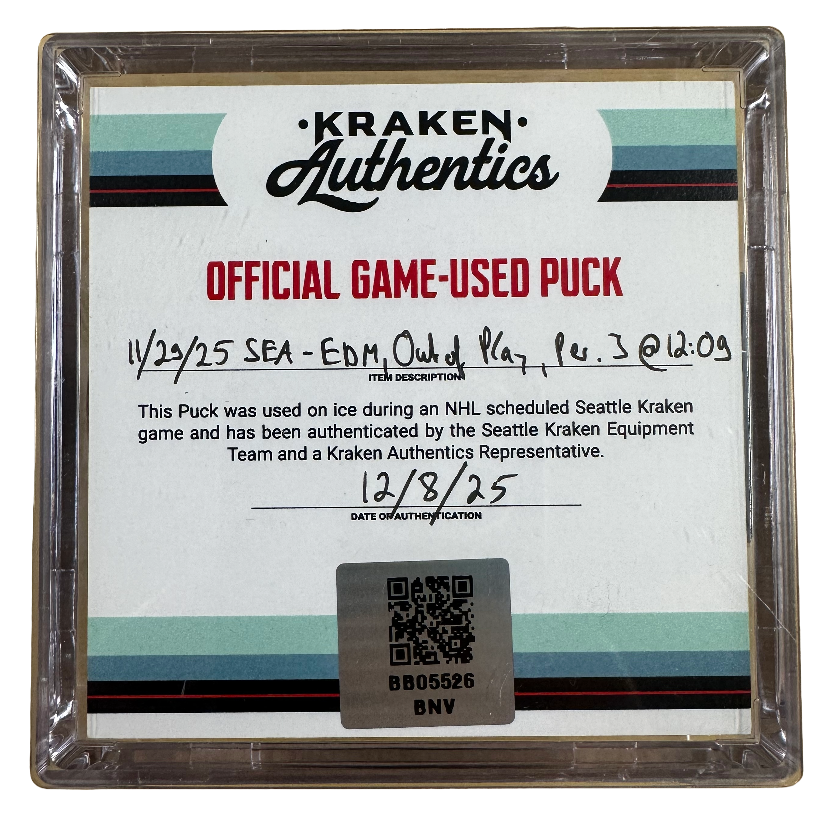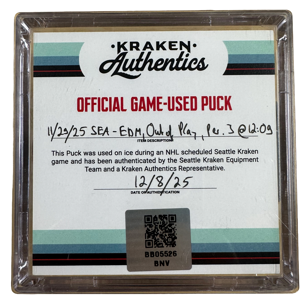 This is an official game-used puck from the Seattle Kraken vs. Edmonton Oilers game on November 29, 2025. This puck went out of play at 12:09 of the 3rd period and was retrieved directly from the ice.