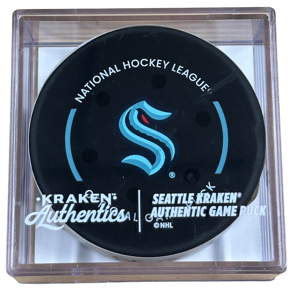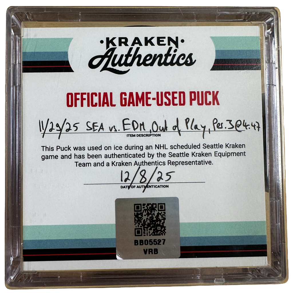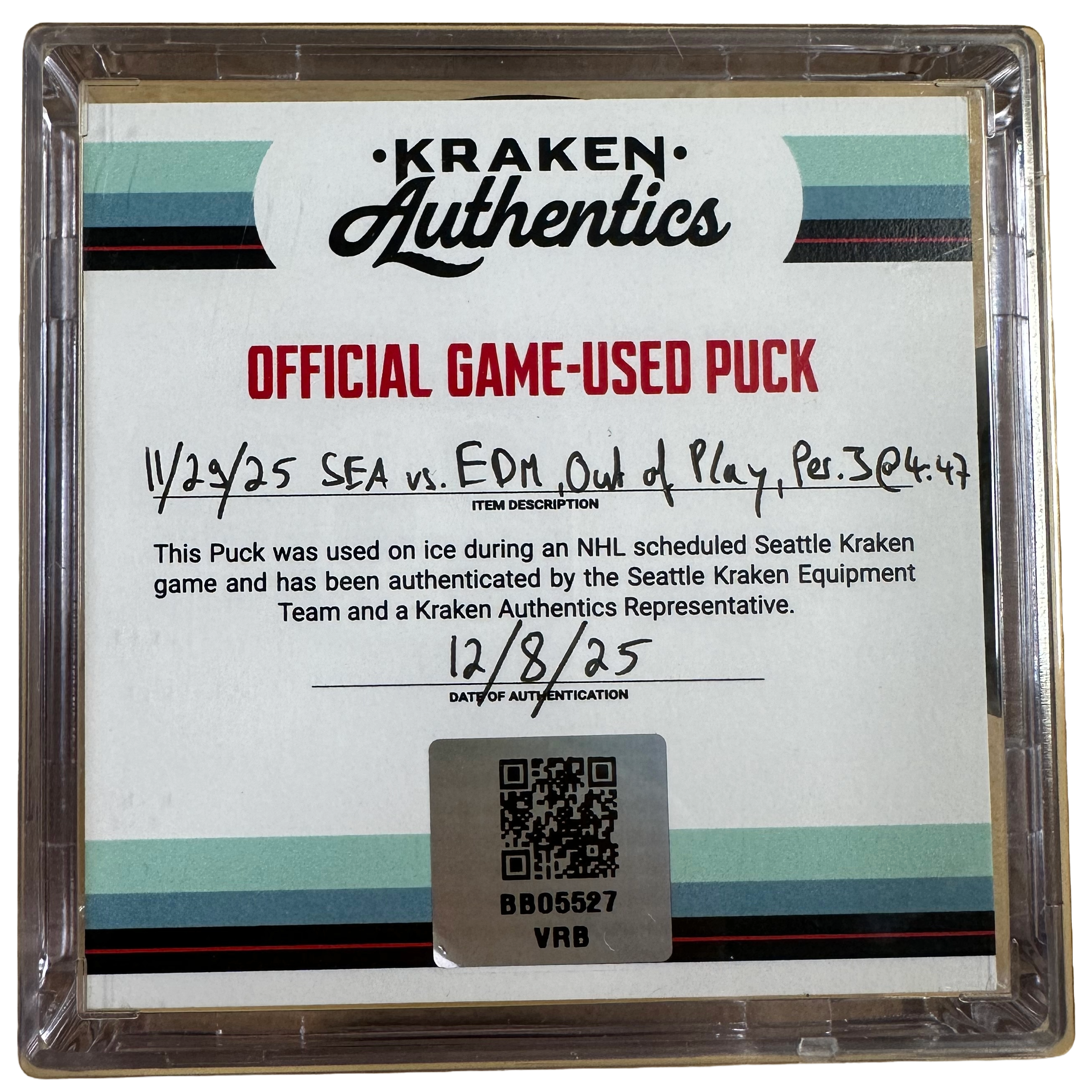 This is an official game-used puck from the Seattle Kraken vs. Edmonton Oilers game on November 29, 2025. This puck went out of play at 4:47 of the 3rd period and was retrieved directly from the ice.