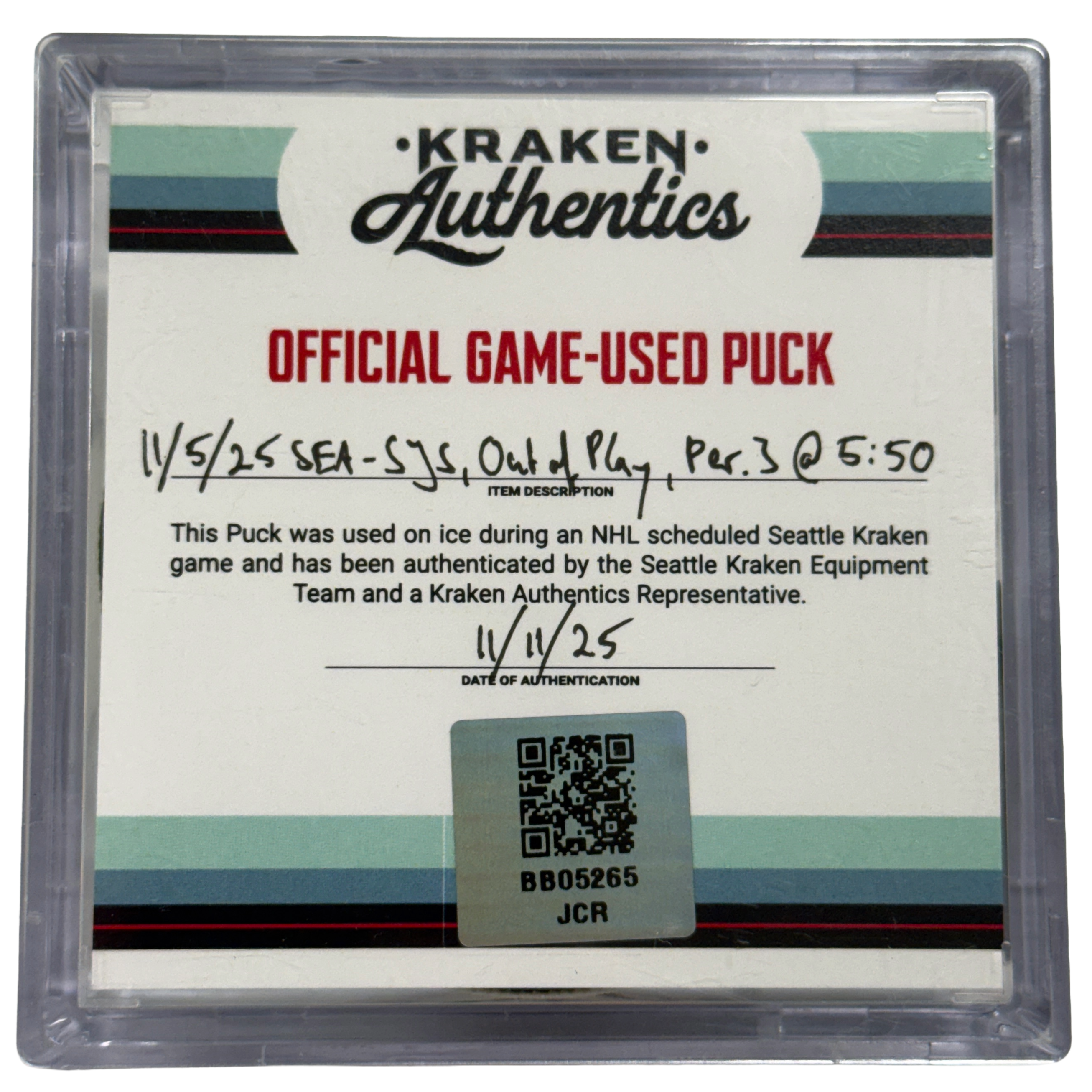 Official game-used puck from the Seattle Kraken vs. San Jose Sharks game on November 5, 2025. The puck went out of play at 5:50 during the 3rd period and was retrieved directly from the ice.