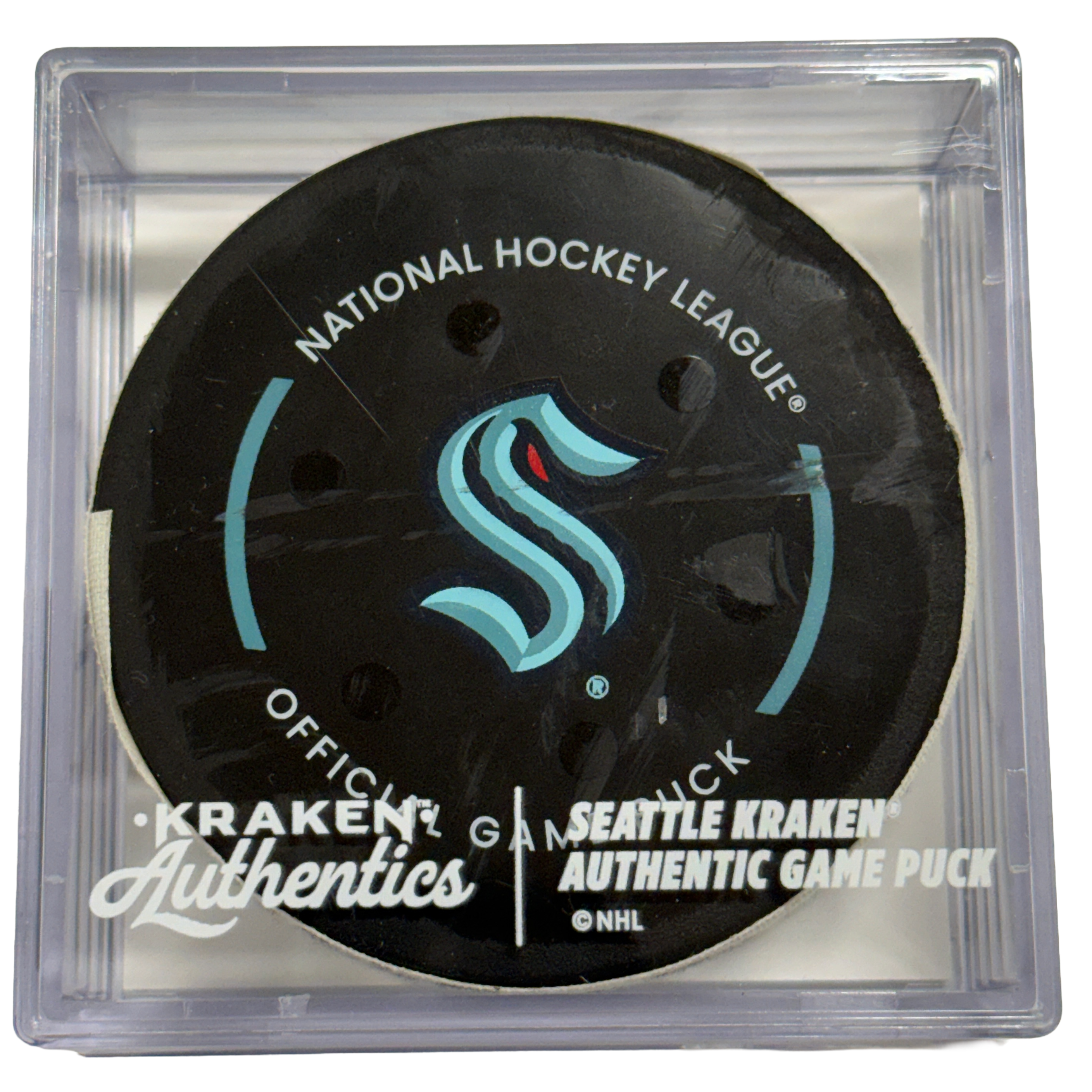 This game-used puck is authenticated by OpSec and includes a Certificate of Authenticity along with a Kraken Authentics puck cube.