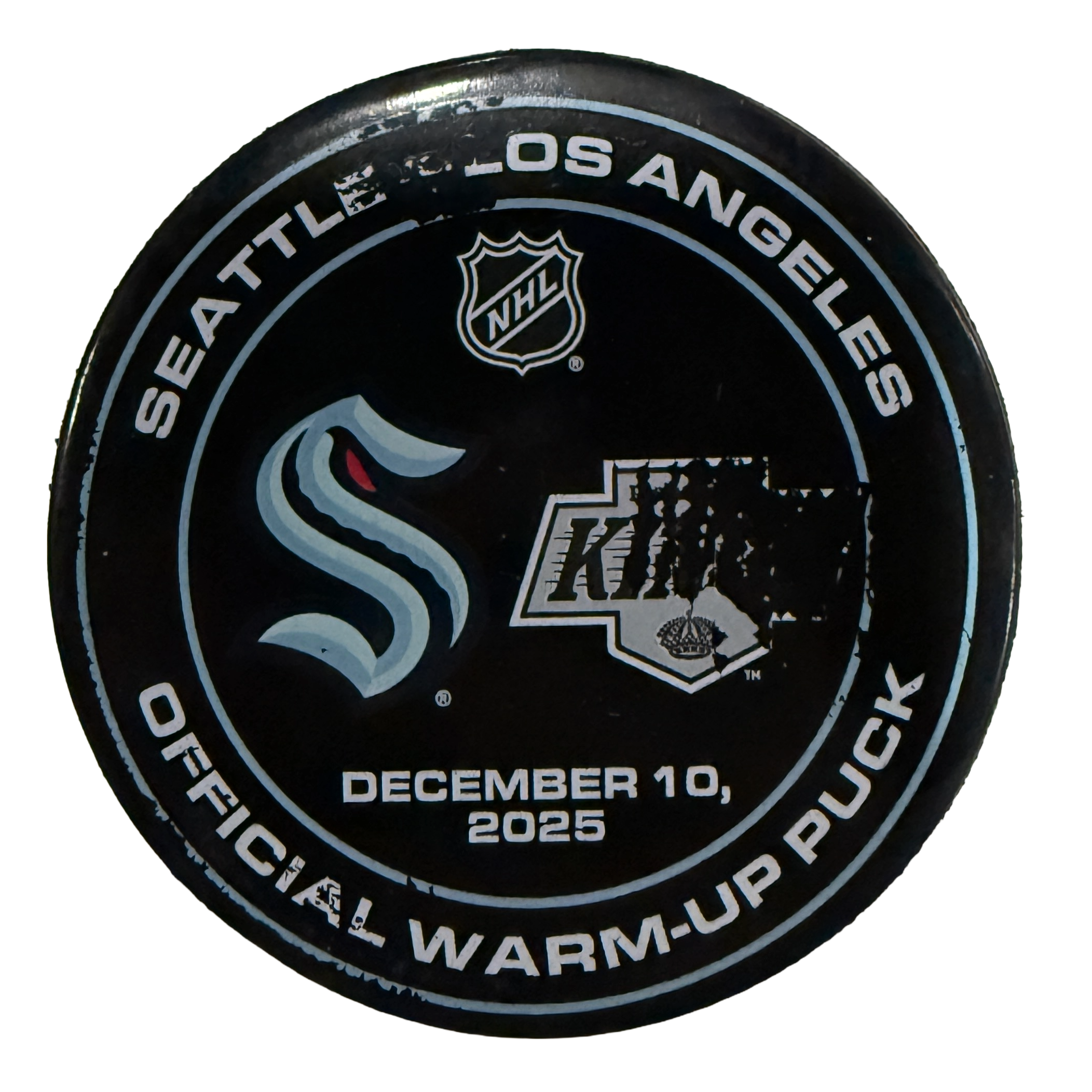 Official warmup puck from the Seattle Kraken’s game against the Los Angeles Kings on December 10th, 2025. This high-quality collectible puck is the perfect addition for collectors and Kraken fans looking to own a piece of Kraken history.