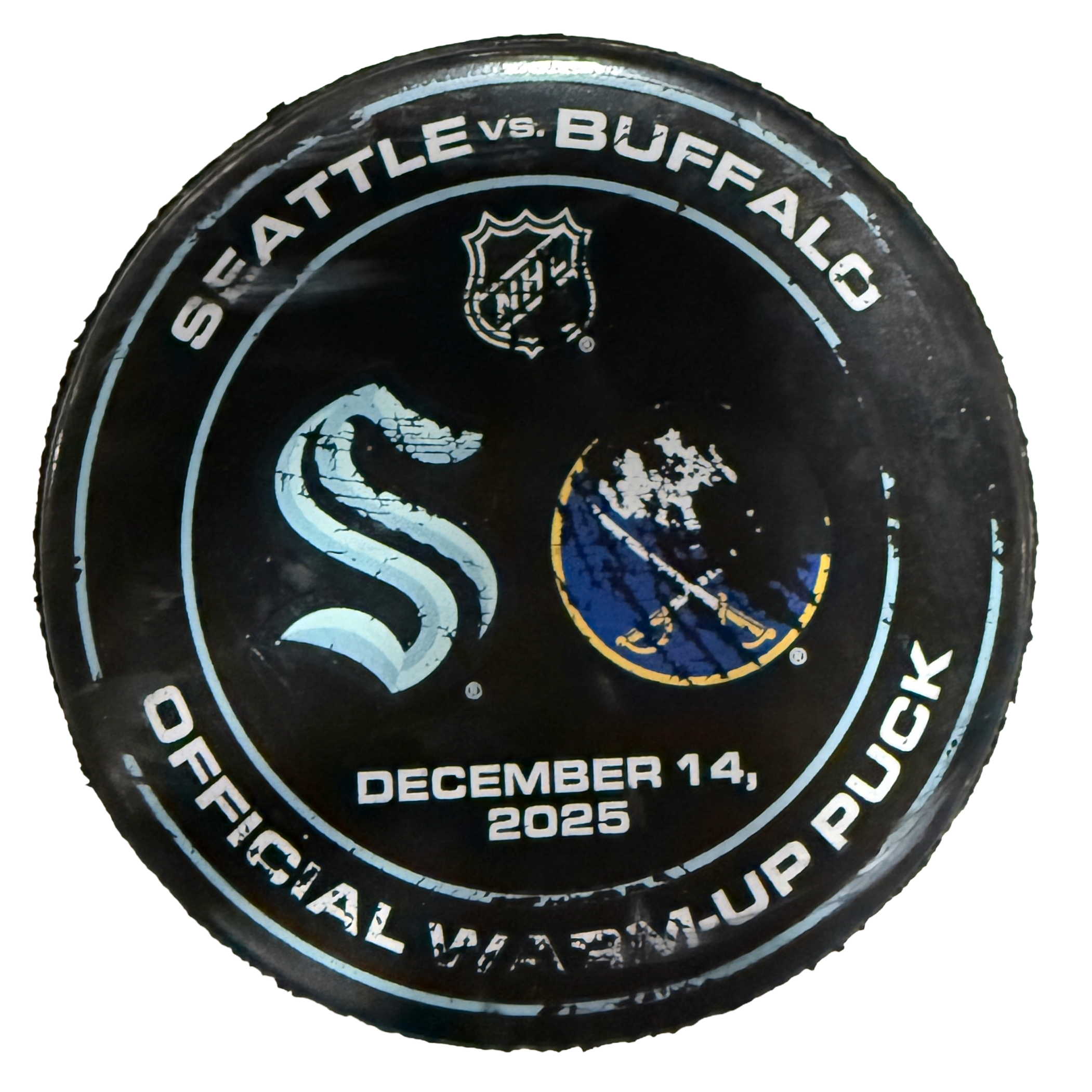 Official warmup puck from the Seattle Kraken’s game against the Buffalo Sabres on December 14th, 2025. This high-quality collectible puck is the perfect addition for collectors and Kraken fans looking to own a piece of Kraken history.