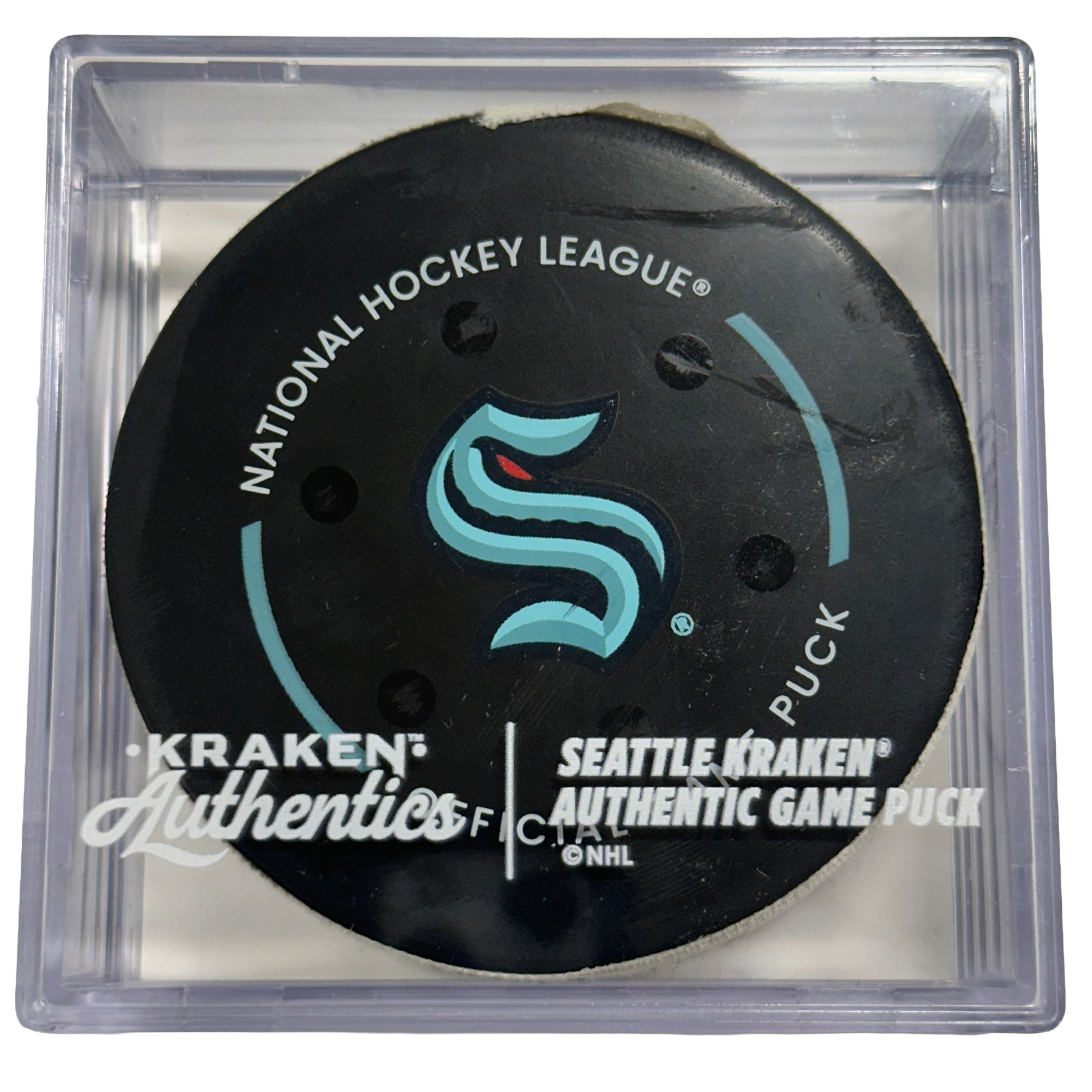 This game-used puck is authenticated by OpSec and includes a Certificate of Authenticity along with a Kraken Authentics puck cube.