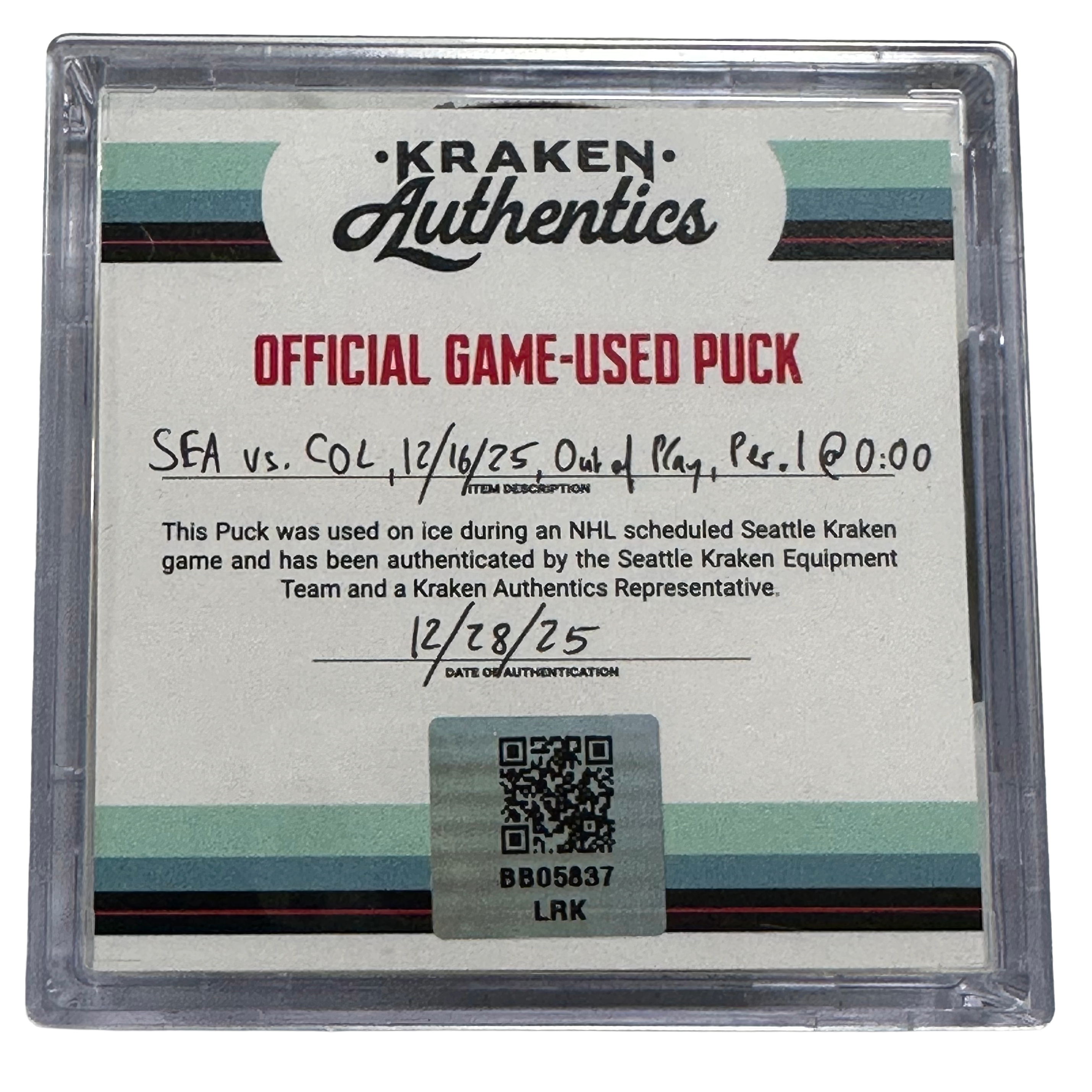 Official game-used puck from the Seattle Kraken vs. Colorado Avalanche game on December 16, 2025. The puck went out of play at 0:00 of the 1st period and was retrieved directly from the ice.