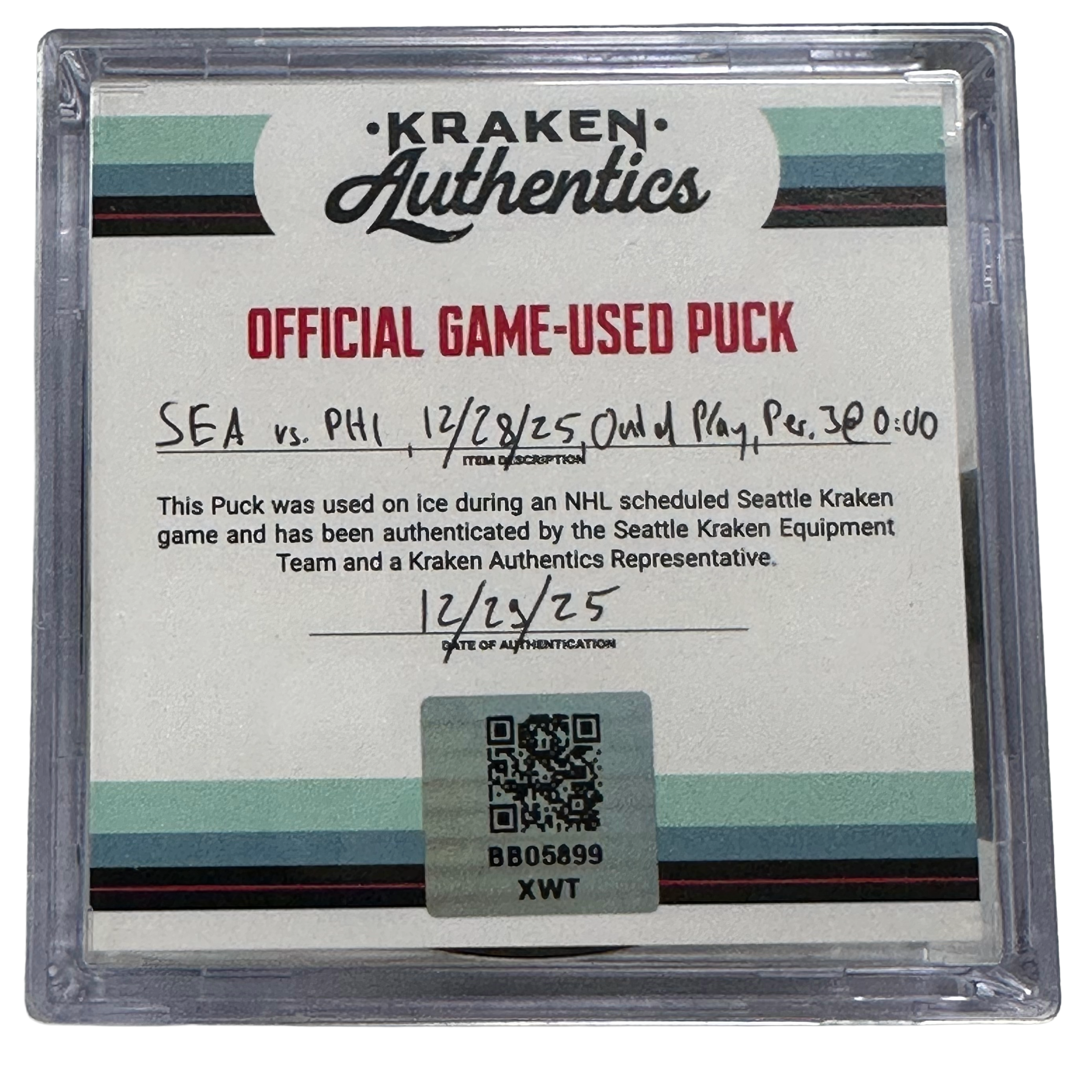 Official game-used puck from the Seattle Kraken vs. Philadelphia Flyers game on December 28, 2025. The puck went out of play at 0:00 of the 3rd period and was retrieved directly from the ice.