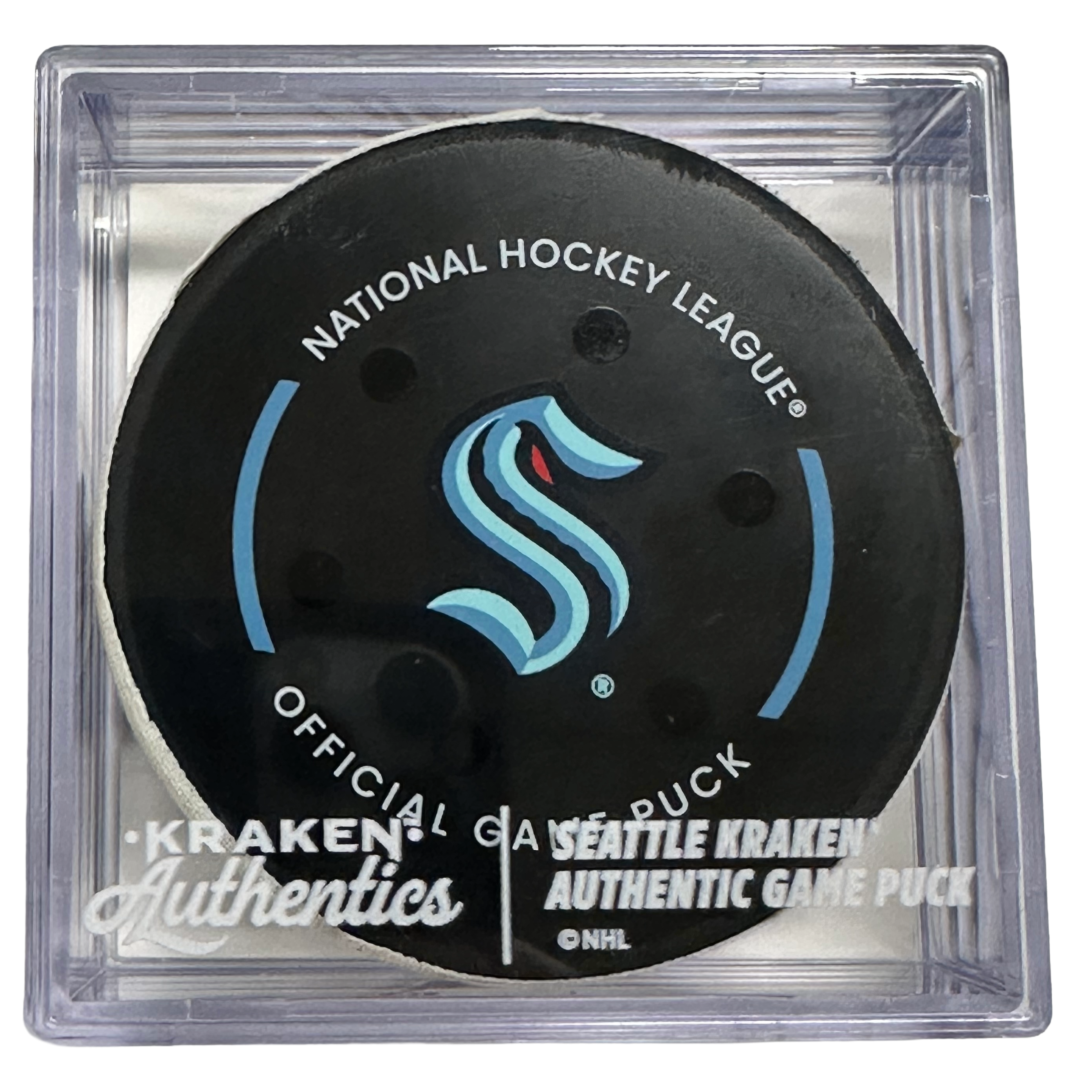This game-used puck is authenticated by OpSec and includes a Certificate of Authenticity along with a Kraken Authentics puck cube.