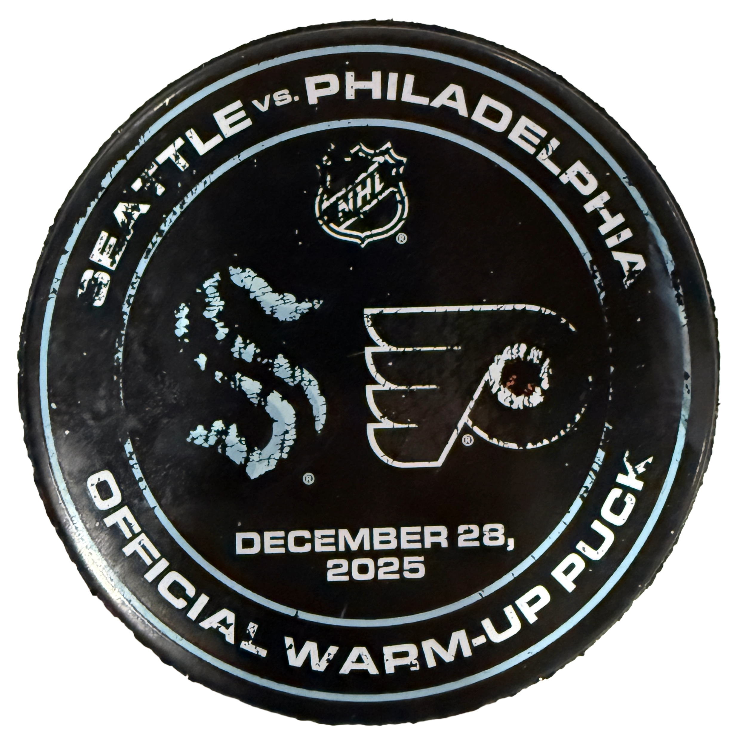 Official warmup puck from the Seattle Kraken’s game against the Philadelphia Flyers on December 28th, 2025. This high-quality collectible puck is the perfect addition for collectors and Kraken fans looking to own a piece of Kraken history.