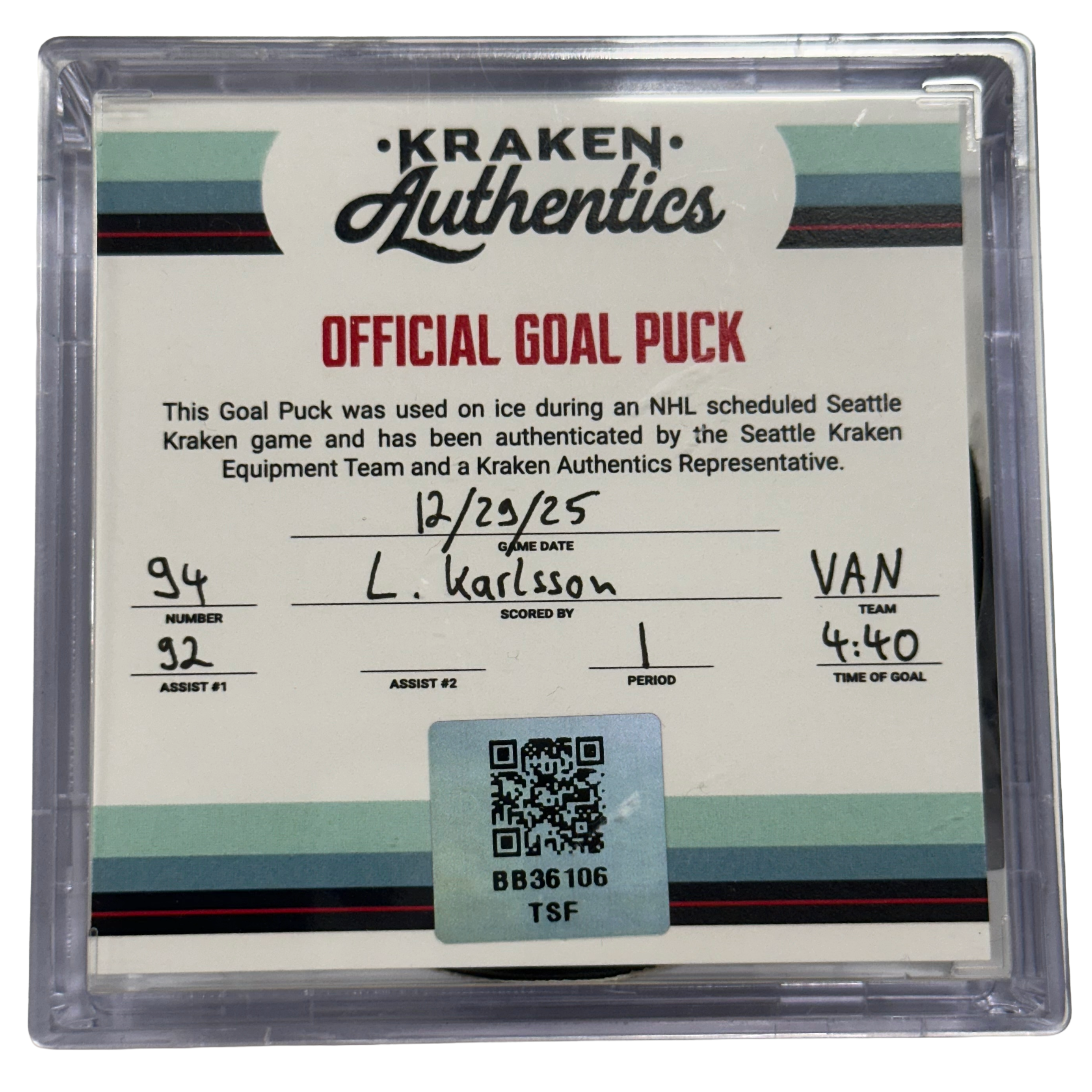 12.29.25 L. Karlsson #94 VAN Goal Puck