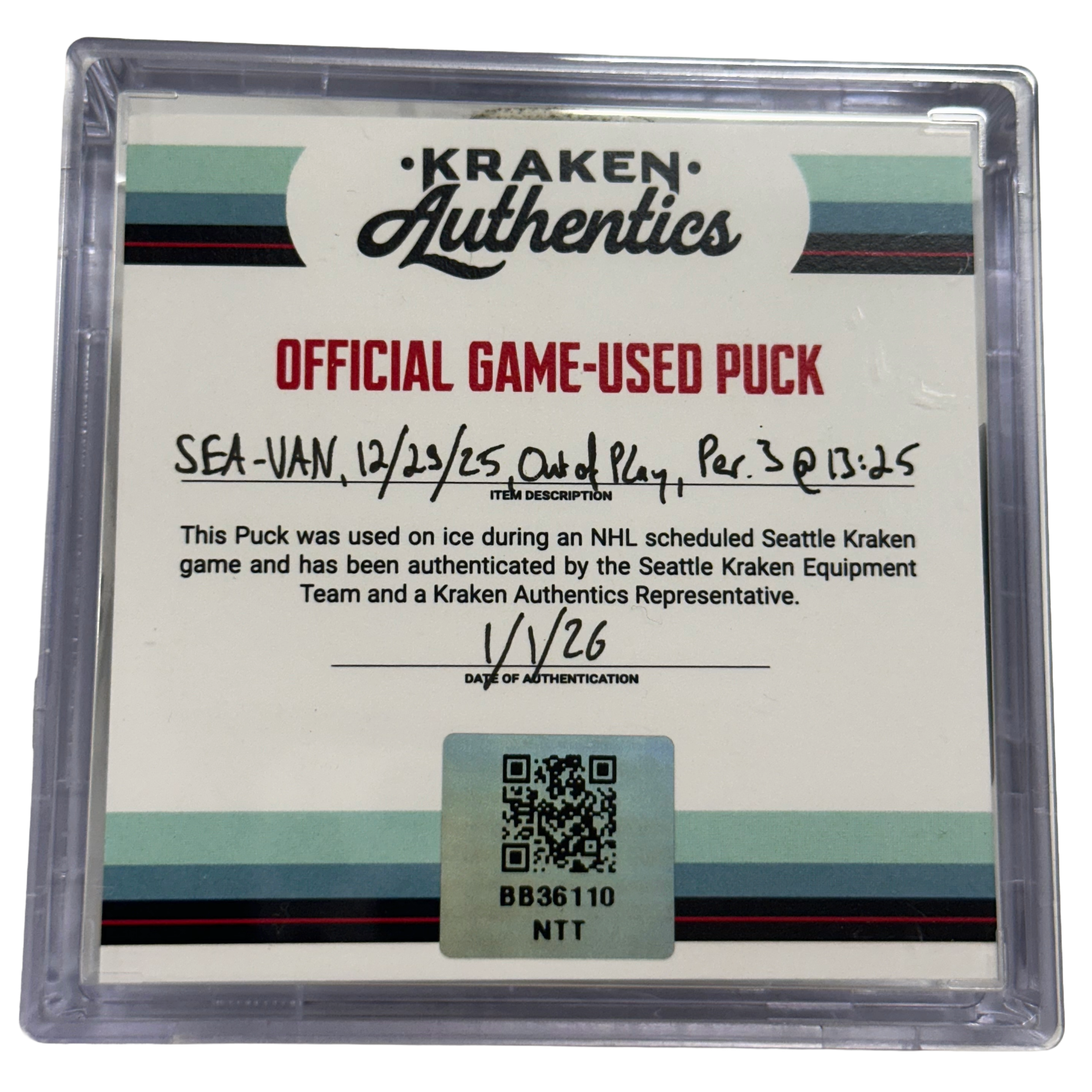 Official game-used puck from the Seattle Kraken vs. Vancouver Canucks game on December 29, 2025. The puck went out of play at 13:25 of the 3rd period and was retrieved directly from the ice.