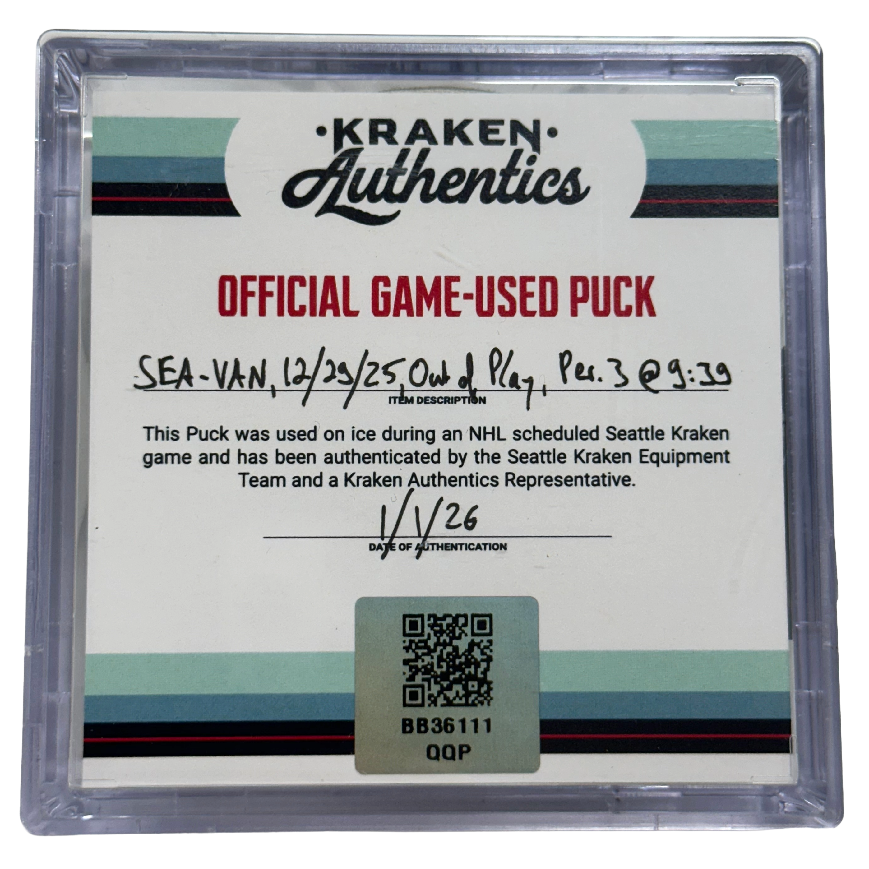 Official game-used puck from the Seattle Kraken vs. Vancouver Canucks game on December 29, 2025. The puck went out of play at 9:39 of the 3rd period and was retrieved directly from the ice.