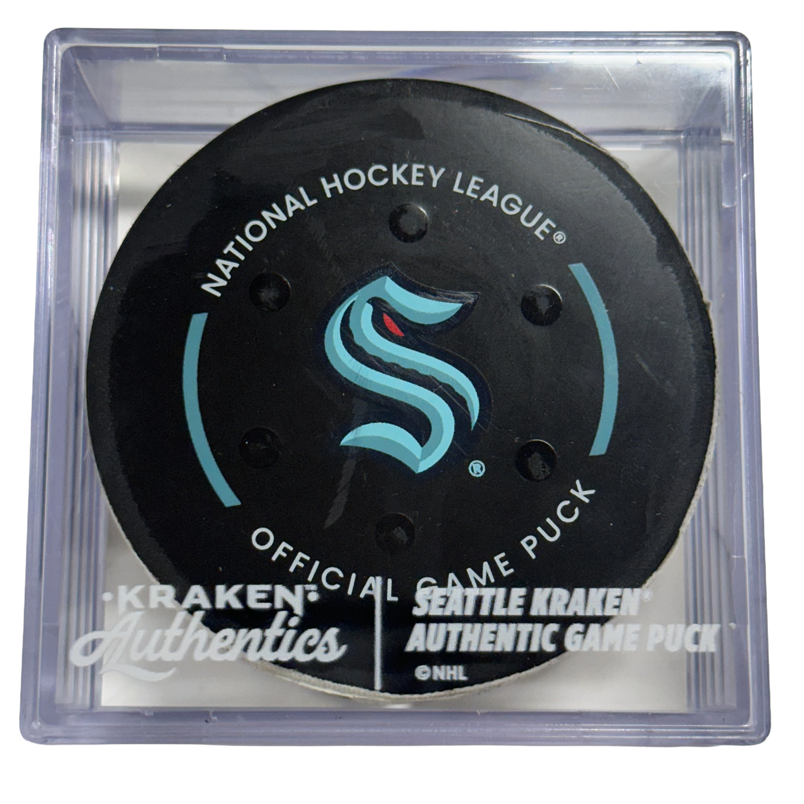 This game-used puck is authenticated by OpSec and includes a Certificate of Authenticity along with a Kraken Authentics puck cube.