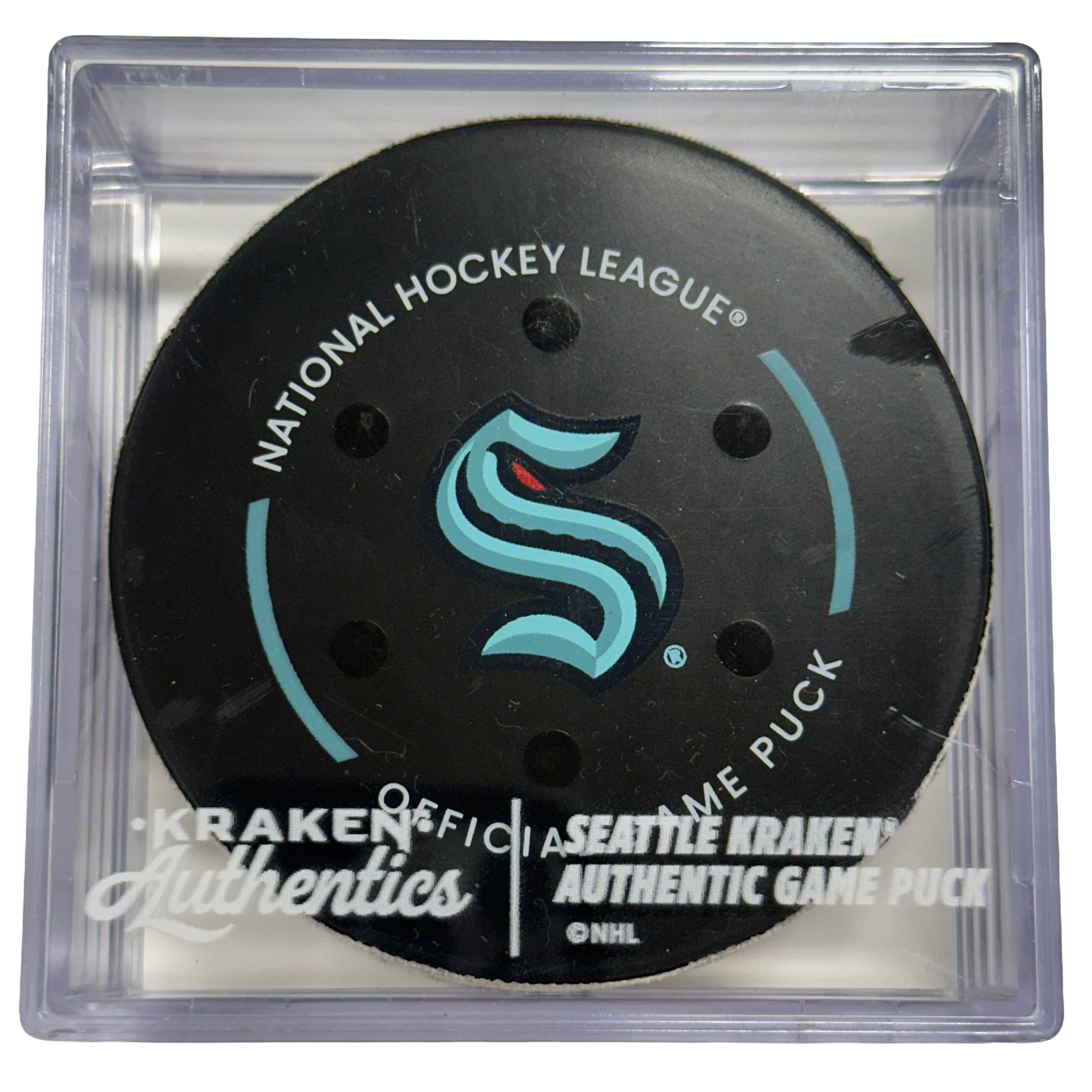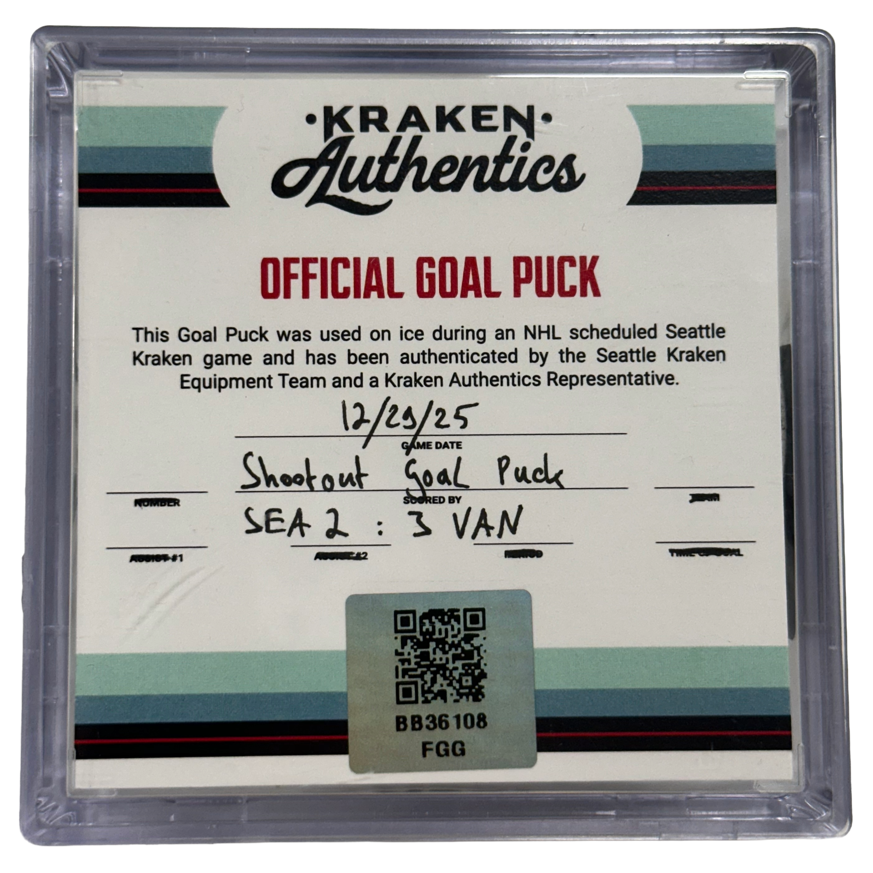 Official game-used goal puck from the Seattle Kraken vs. Vancouver Canucks game on December 29th 2025.