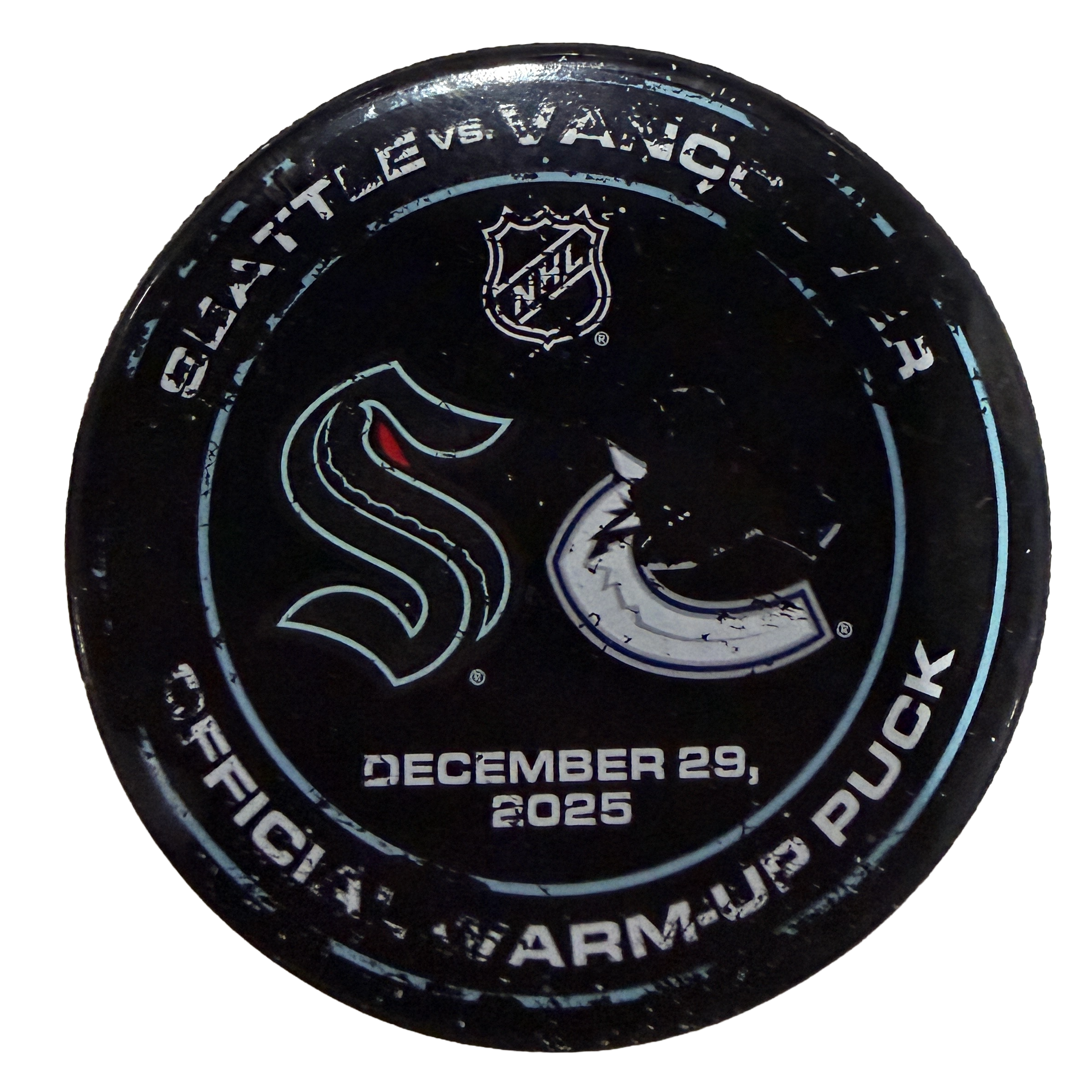 Official warmup puck from the Seattle Kraken’s game against the Vancouver Canucks on December 29th, 2025. This high-quality collectible puck is the perfect addition for collectors and Kraken fans looking to own a piece of Kraken history.