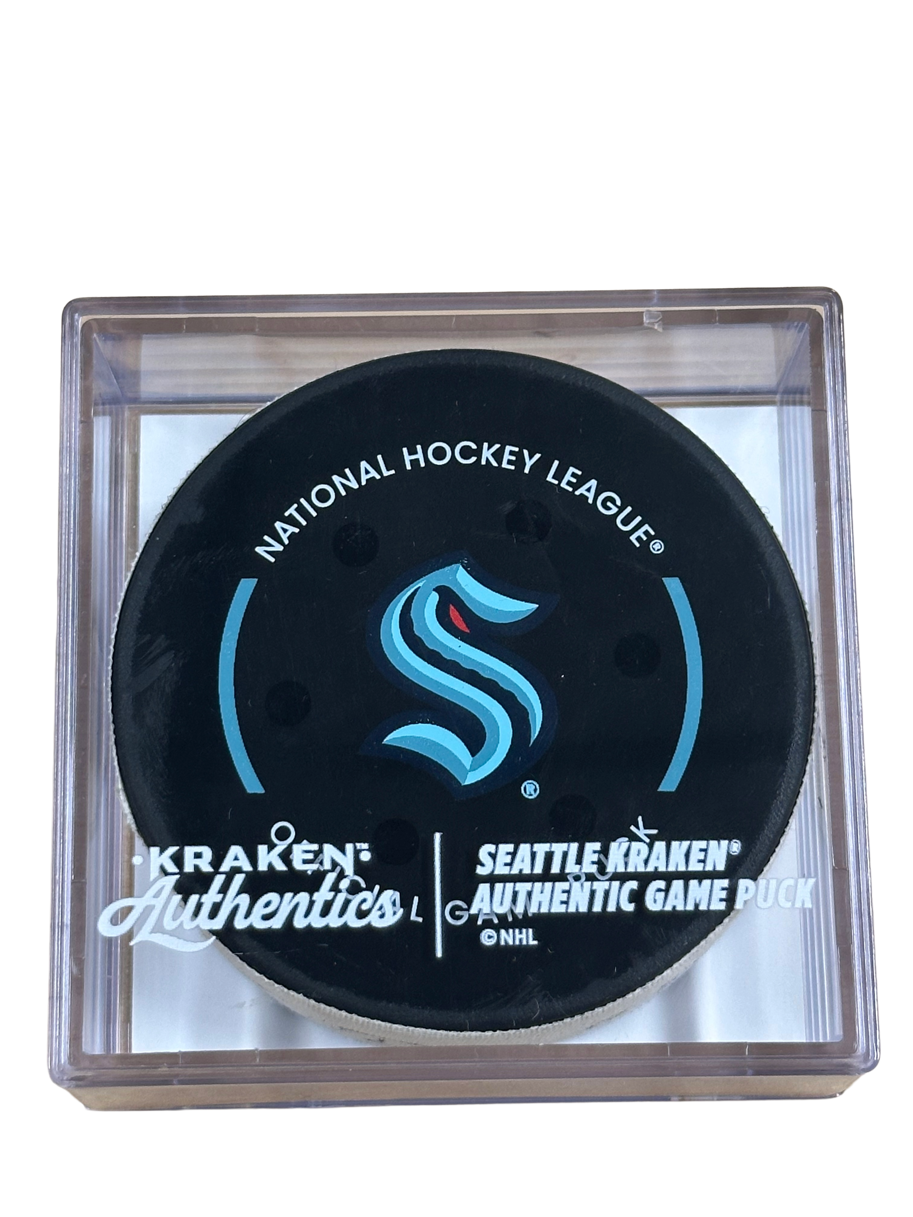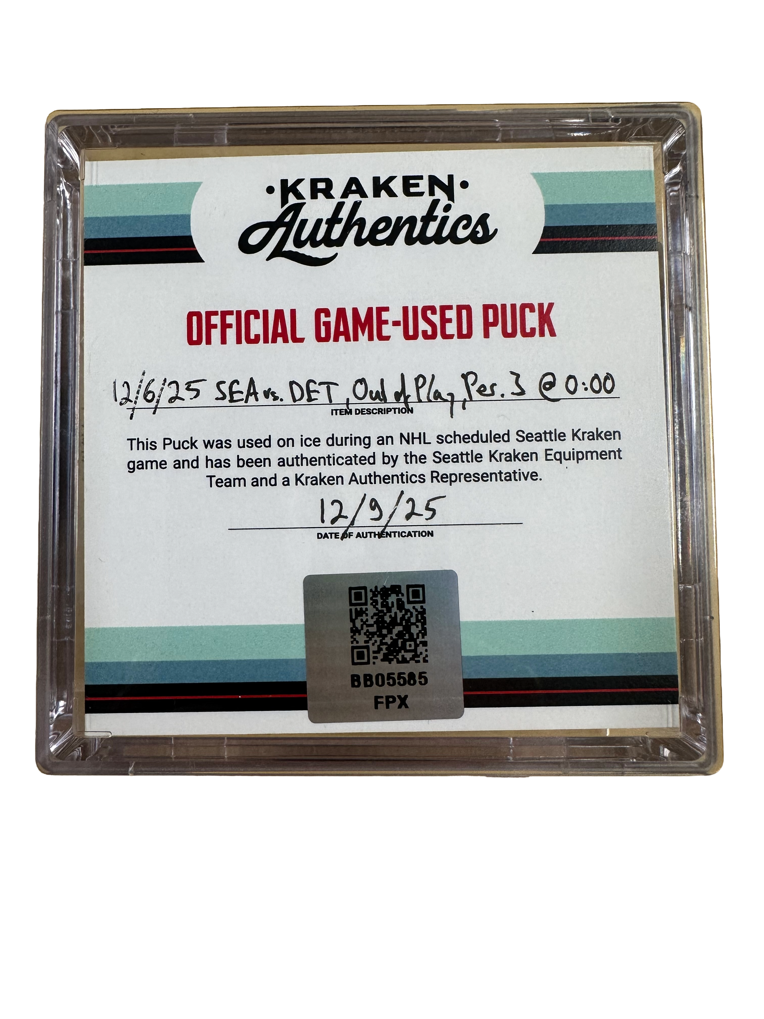 Official game used puck from the Seattle Kraken against the Detroit Red Wings on December 6th, 2025. This puck went out of play in the 3rd period @ 0:00.