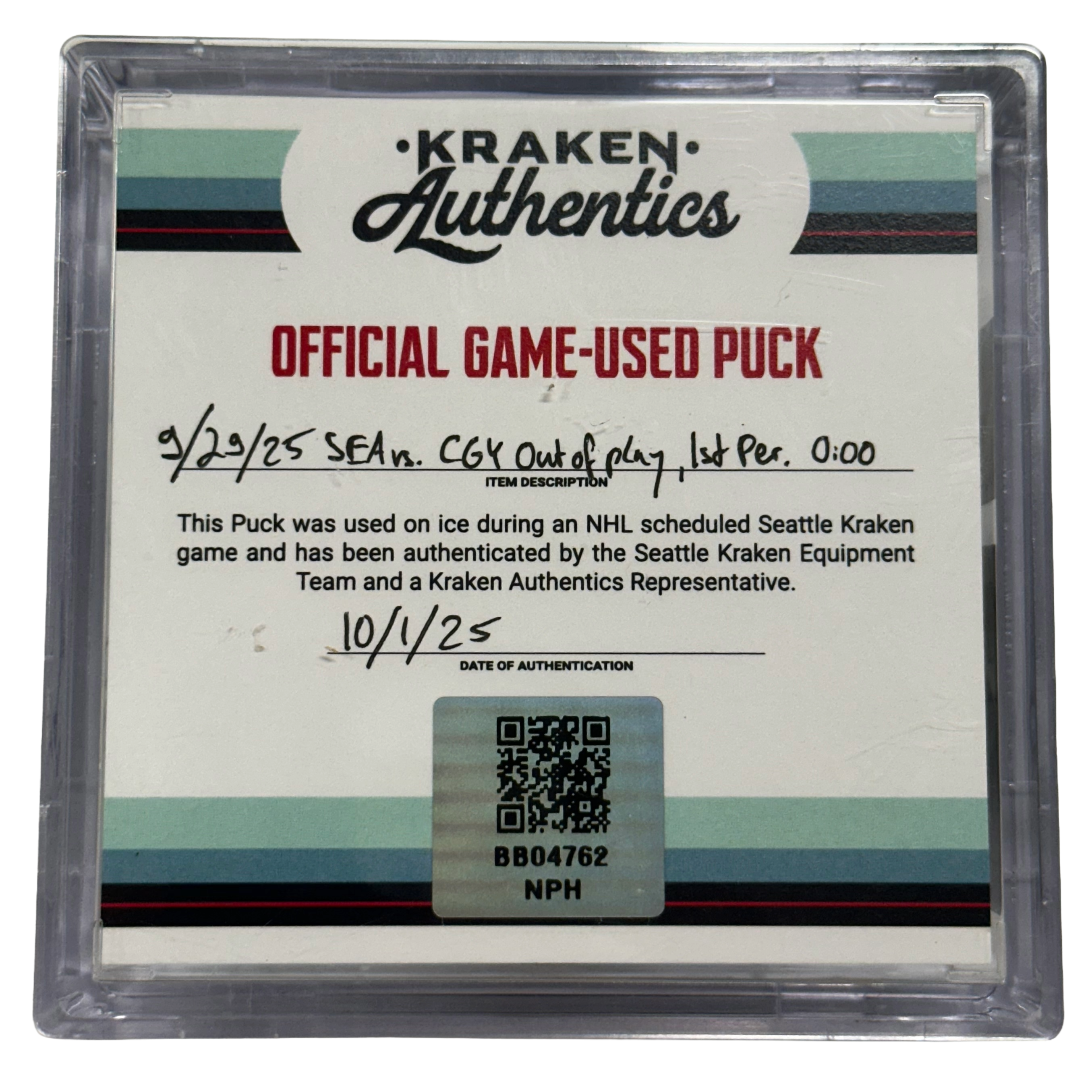 Official game-used puck from the Seattle Kraken vs. Calgary Flames game on September 29, 2025. The puck went out of play at 0:00 of the 1st period and was retrieved directly from the ice.