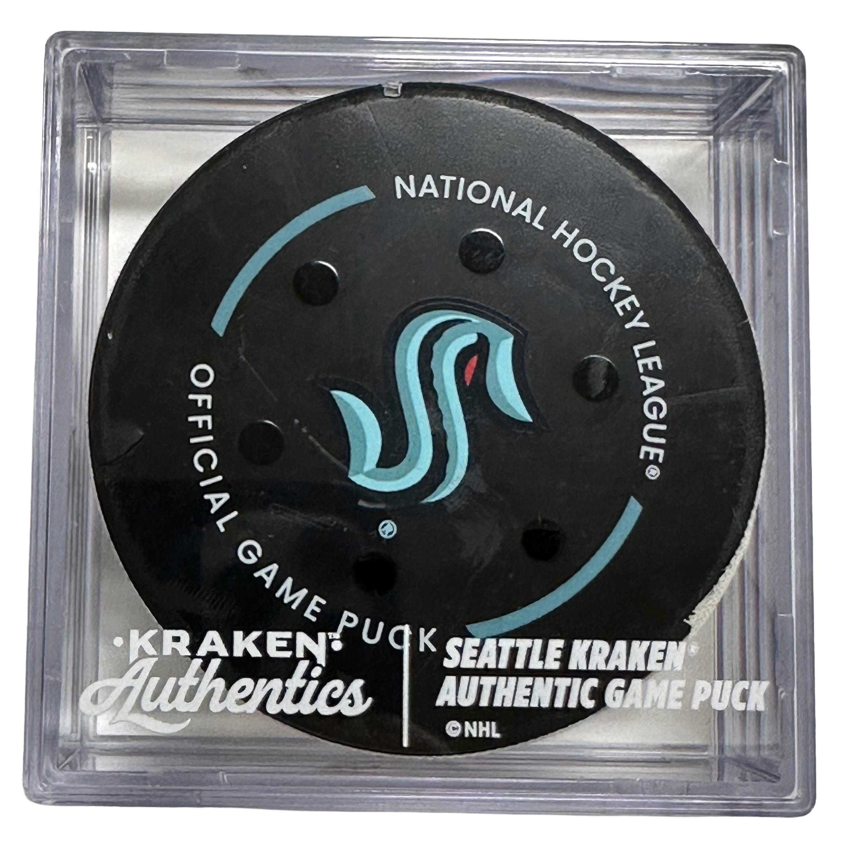 This game-used puck is authenticated by OpSec and includes a Certificate of Authenticity along with a Kraken Authentics puck cube.